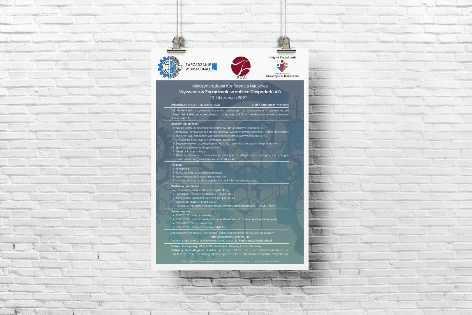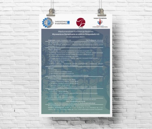 W dniach 23-24.06.2022 r. Instytut Zarządzania Uniwersytetu w Białymstoku organizuje Międzynarodową Konferencję Naukową „Wyzwania w zarządzaniu w obliczu Gospodarki 4.0”.