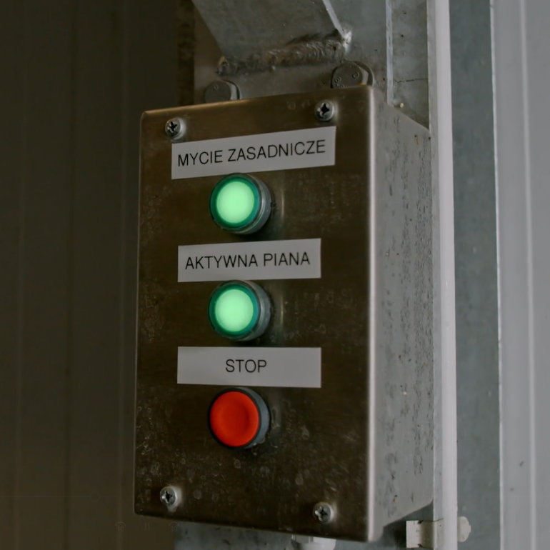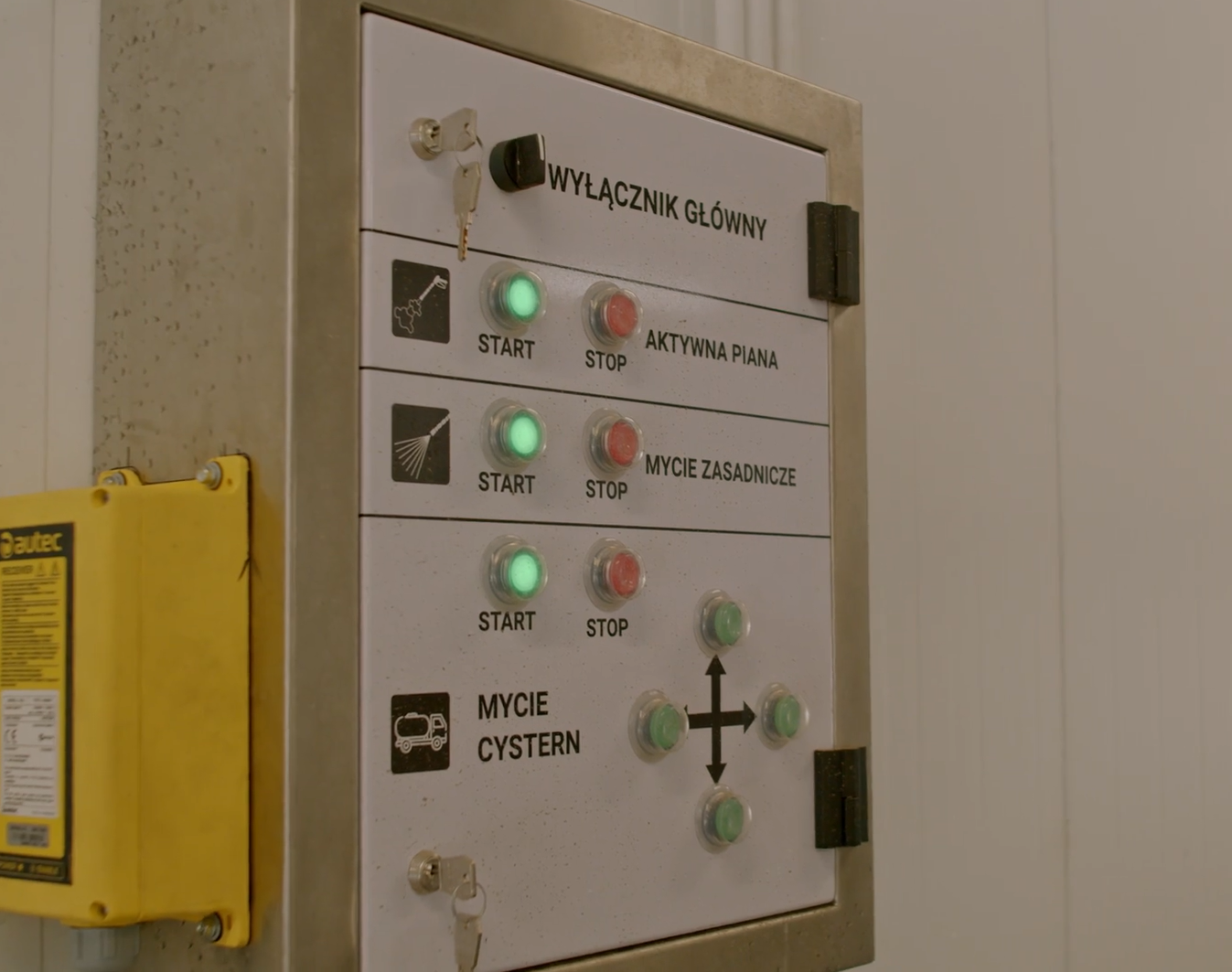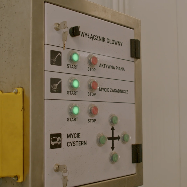Jednym z wyzwań było zaplanowanie sterowania poszczególnymi stanowiskami w sposób maksymalnie ułatwiający prace operatorów. Postawiliśmy na 3 różne rozwiązania pozwalające na obsługę myjni w zależności od zapotrzebowania. Na podestach po obu stronach obiektu znajdują się główne panele sterujące, które pozwalają na obsługę wszystkich stanowisk – głowicy, pistoletów do mycia zasadniczego oraz pistoletów odpowiedzialnych za wytwarzanie aktywnej piany. System został dodatkowo wyposażony w 2 panele w sekcji dolnej, umieszczone również po obu stronach obiektu, pozwalające na obsługę stanowisk z pistoletami znajdującymi się w dolnej sekcji myjni. Ostatnim z elementów sterowania jest odbiornik radiowy pozwalający na obsługę głowicy do mycia cystern, która jest podwieszona nad samochodem.