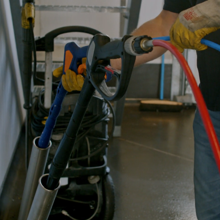 Myjnia wykorzystuje gorącą wodę z zasobów zakładu. Wymagało to od nas zastosowania odpowiednich urządzeń. Finalnie instalację oparliśmy na urządzeniach wysokociśnieniowych marki IPC umożliwiających tłoczenie gorącej wody o temperaturze do 95 st. C. W maszynowni poza dwoma niezależnymi myjkami wysokociśnieniowymi znajduje się urządzenie odpowiedzialne za system aktywnej piany.