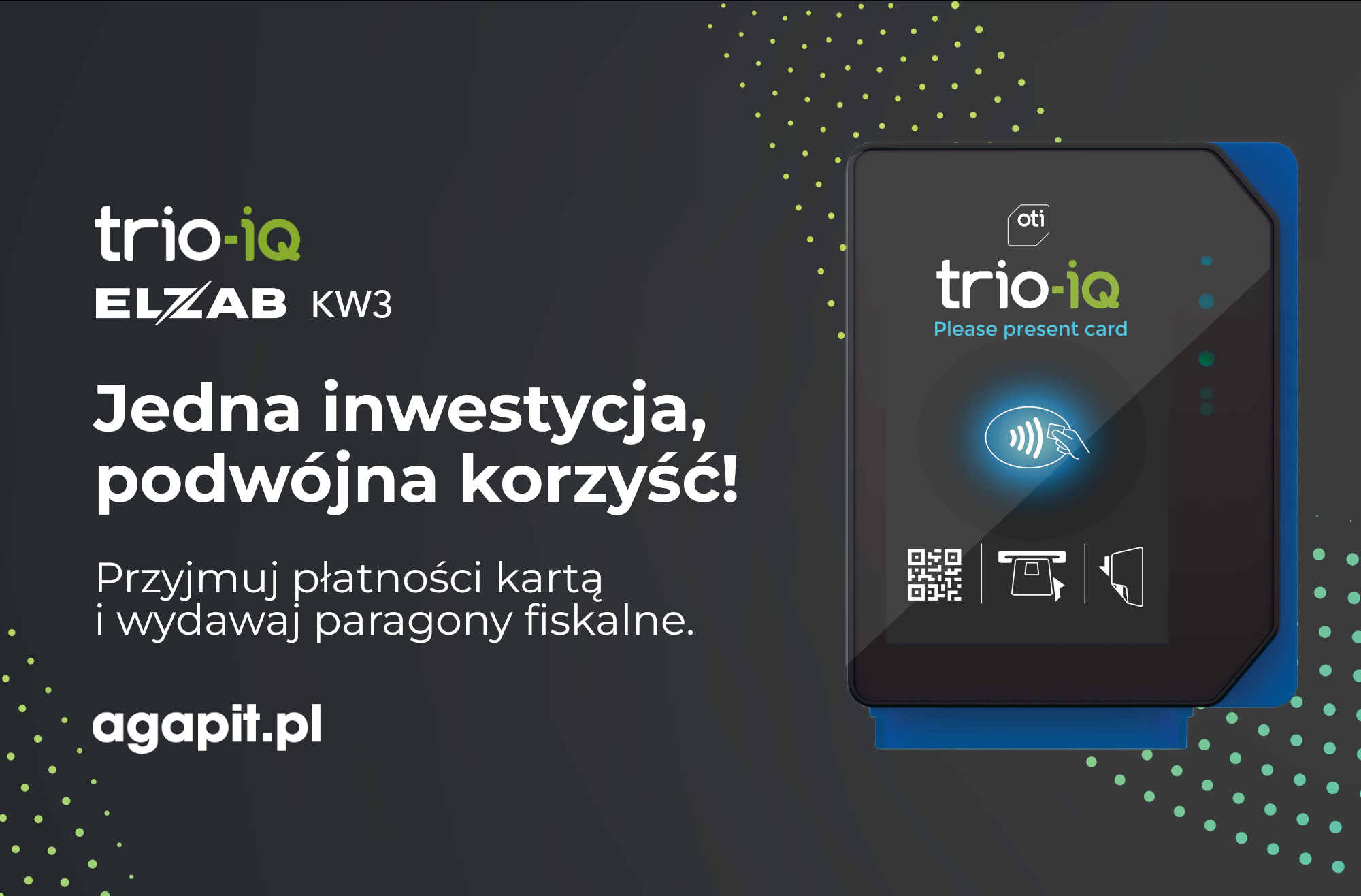 Rozwiązanie firmy ELZAB to kasa fiskalna KW3 zintegrowana z terminalem płatniczym Trio-IQ. Jedna wizyta montażowa, jeden koszt dojazdu, jeden serwis – dwie korzyści. Możliwość płatności kartą zapewni większą ilość klientów, co za tym idzie zarabiasz więcej, jednocześnie spełniając warunki narzucone przez ustawodawcę.