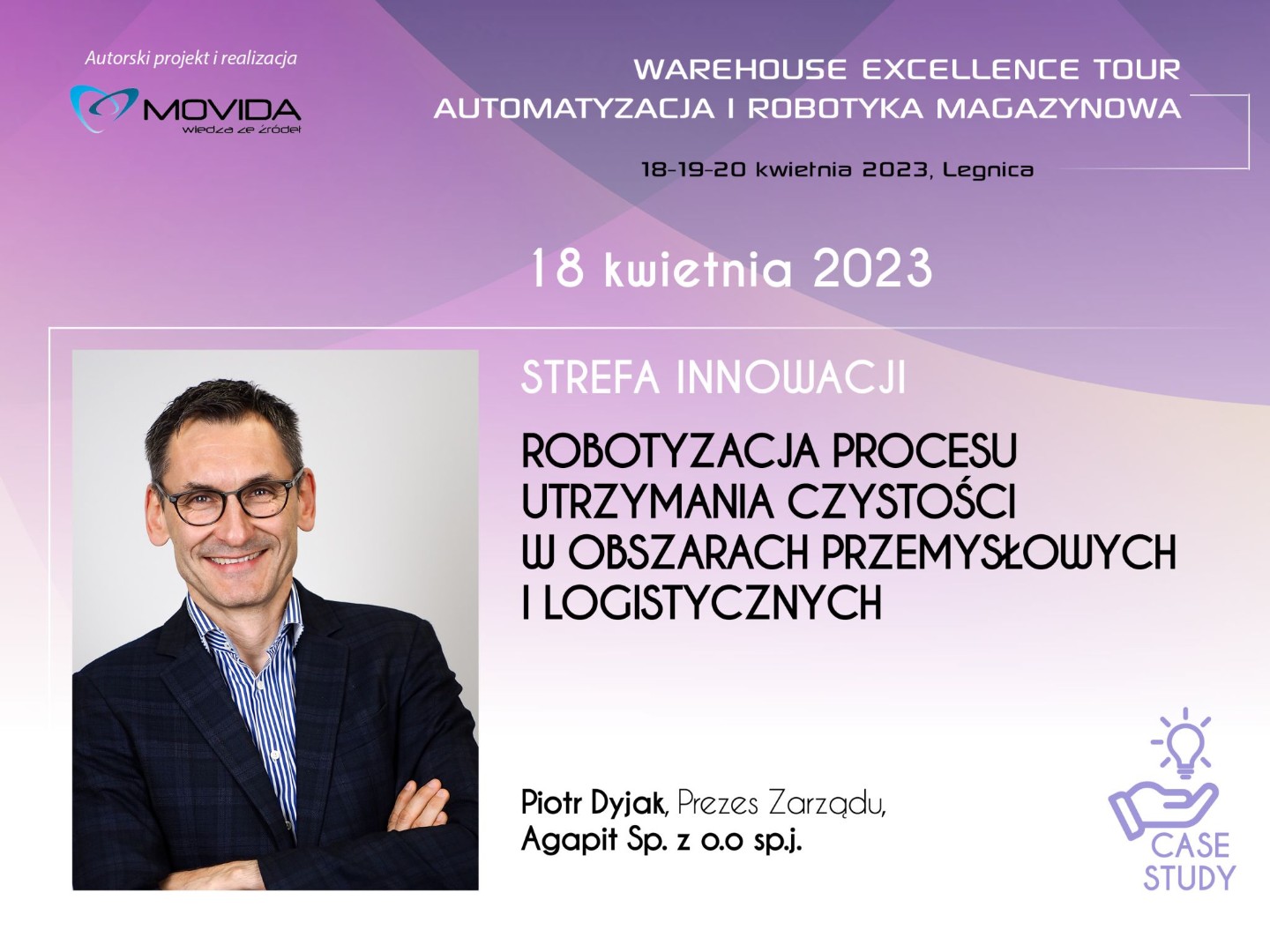 Aktywność na wielu płaszczyznach jest dla nas niezwykle istotna. Tym razem postanowiliśmy wziąć udział w wydarzeniu organizowanym przez MOVIDA Spółka z ograniczoną odpowiedzialnością Sp. k.. Jednym z elementów wydarzenia Warehouse Excellence Tour jest panel dot. automatyzacji i robotyzacji procesów - to właśnie w tej kwestii Prezes Zarządu Piotr Dyjak opowie o robotyzacji procesu utrzymania czystości w obszarach przemysłowych i logistycznych. Do zobaczenia już 18 kwietnia!