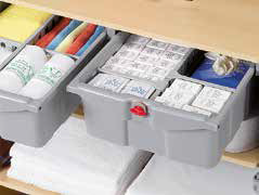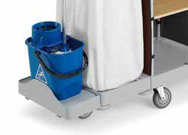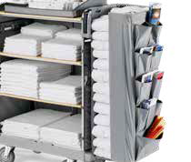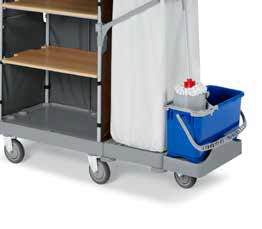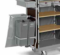 Plastikowa, wysuwana szuflada, 10L i 22L zamykana kluczykiem Poręczne plastikowe półki boczne Pojemnik i uchwyt na worek do selektywnej zbiórki odpadów Zestaw kieszeni na dodatkowe akcesoria Przydatny ogranicznik drzwi Wózki z serii Morgan Hotel mogą być używane z różnymi systemami mopowania na mokro: