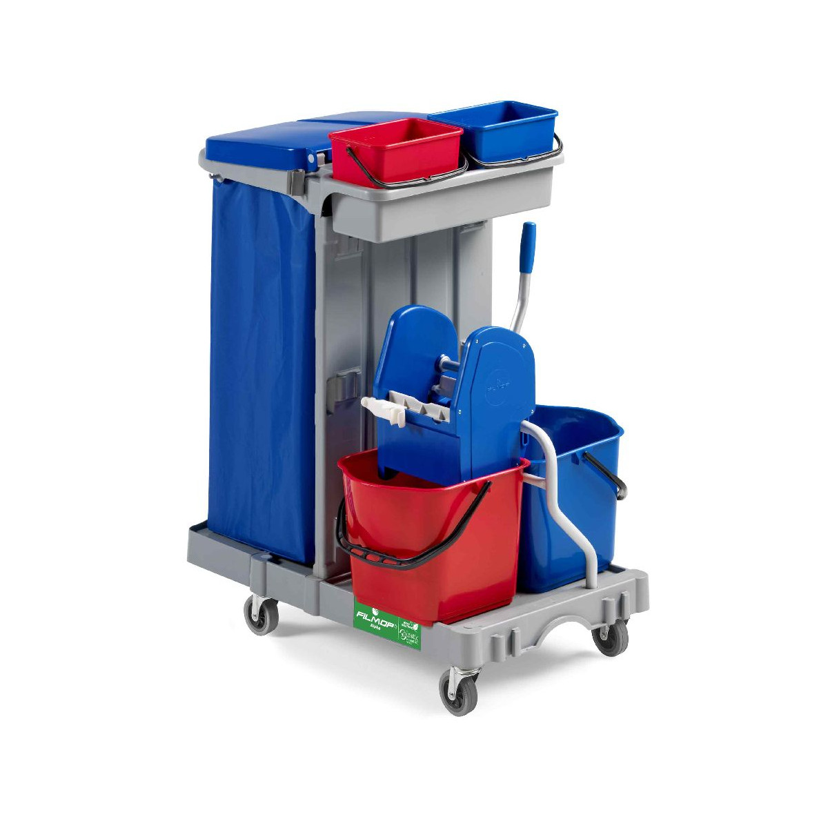 Wózek wielofunkcyjny, idealny do miejsc, w których wymagane jest odkurzanie, zbieranie śmieci, mycie podłóg i czyszczenie powierzchni