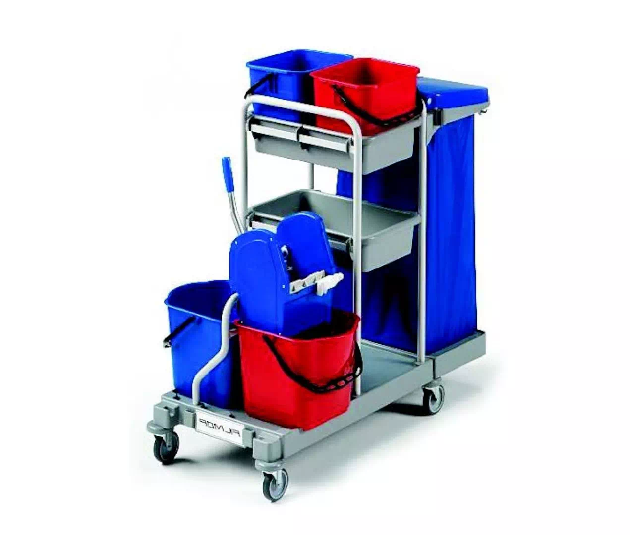 Wyposażony w plastikową podstawę z kołami o średnicy 100mm, 2 ramki, 2 kuwety, wiaderka plastikowe 2x6 l, wiaderka plastikowe 2x15 l z wyciskarką, uchwyt plastikowy na worek na śmieci 120 l z napinaczem i wzmocnieniami.