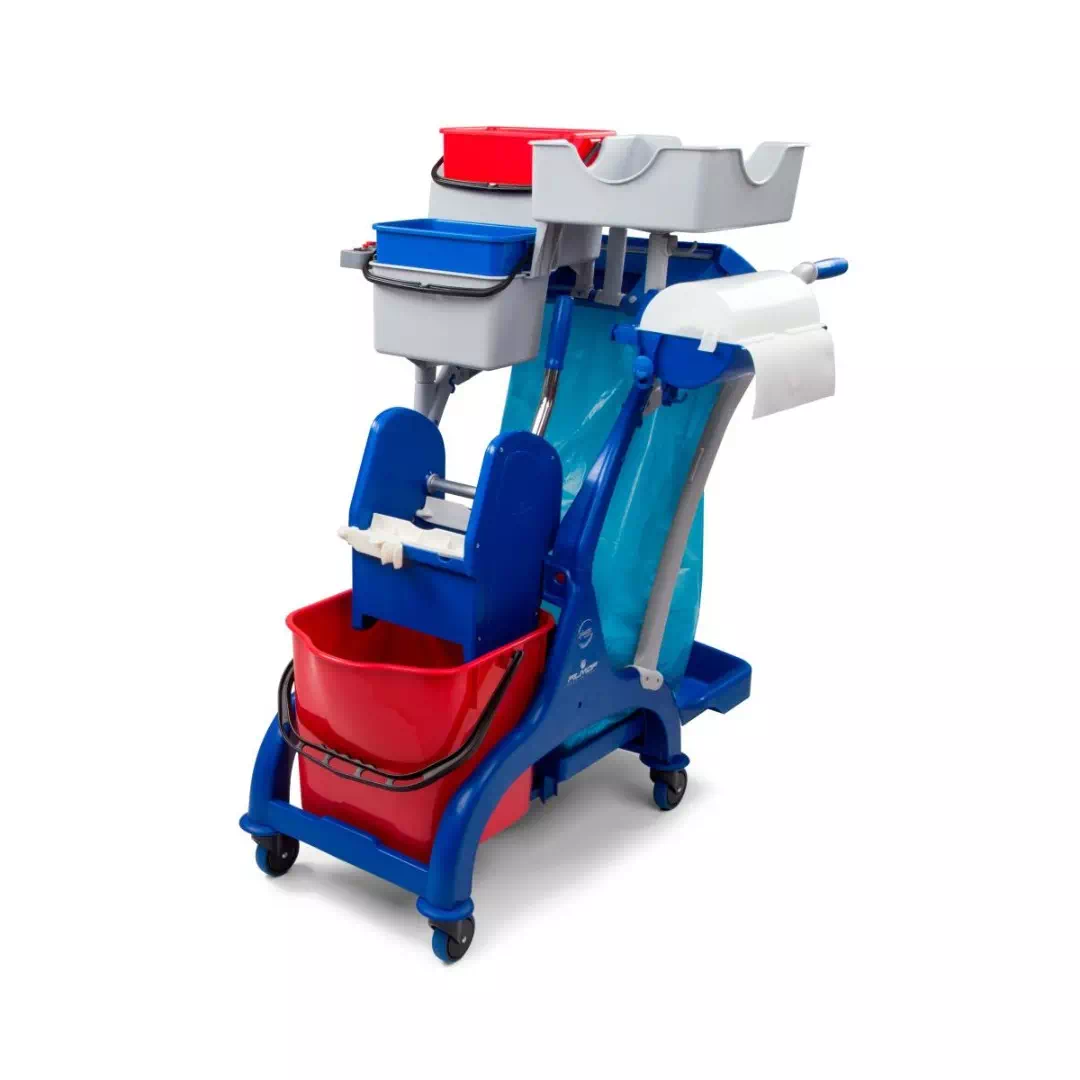Wózek serwisowy Arka to Wózek wielofunkcyjny, idealny do miejsc, w których wymagane jest odkurzanie, zbieranie śmieci, mycie podłóg i czyszczenie powierzchni.