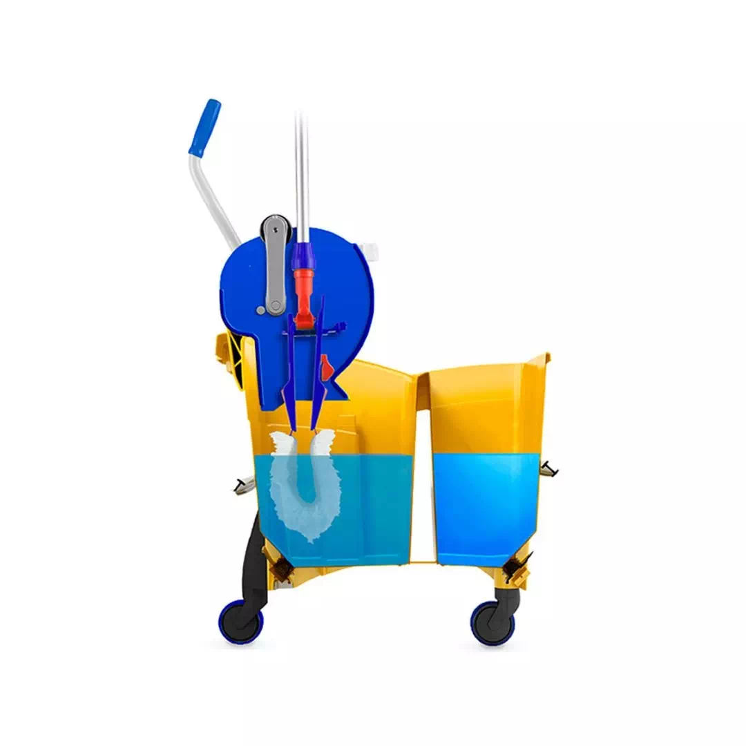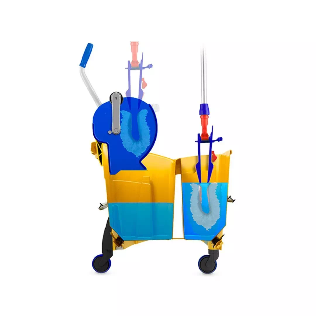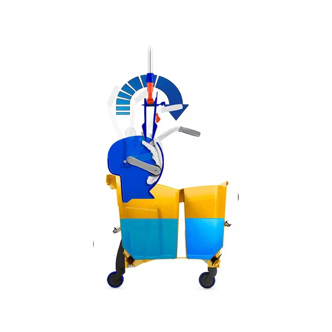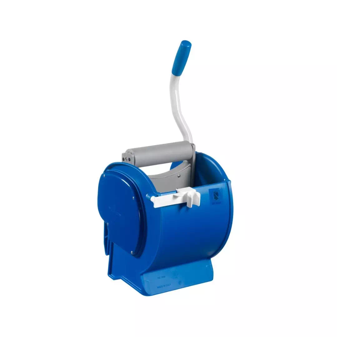 - Wyciskarka z rolką i bez dna, która pozwala na wypłukanie i wyciśnięcie płaskiej głowicy mopa bezpośrednio wewnątrz wyciskarki do wiadra, redukując koszty, czas pracy i nieprzyjemne kapanie na podłogę