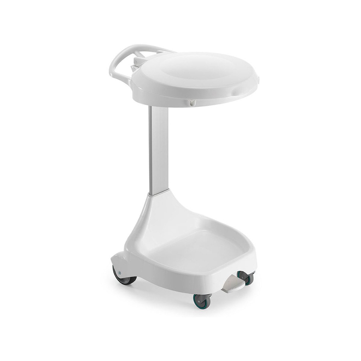 Biały, plastikowy wózek Delta, do worków na śmieci 1x60L + 2x30L, z 4 kołami, pokrywą i pedałem do otwierania pokrywy.