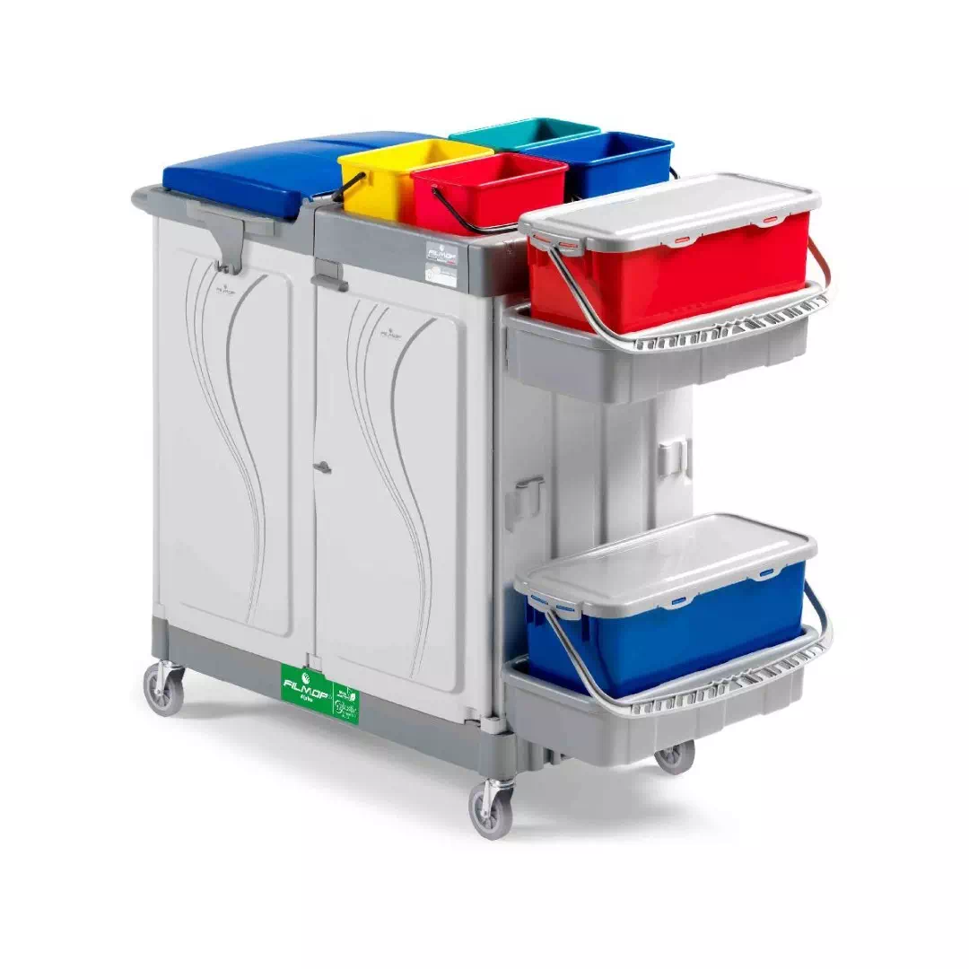Wózek przeznaczony do zbiórki odpadów oraz do wycierania na mokro i/lub dezynfekcji w szpitalach, domach opieki, przychodniach, gabinetach lekarskich, z systemem wstępnego namaczania mopem z hermetycznymi wiadrami Top-Down.