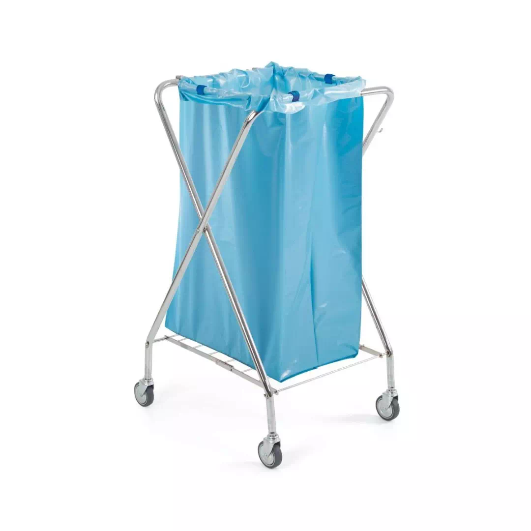Chromowany wózek typu X z kwadratowym uchwytem na worek 120 L i kółkami ø 80 mm.