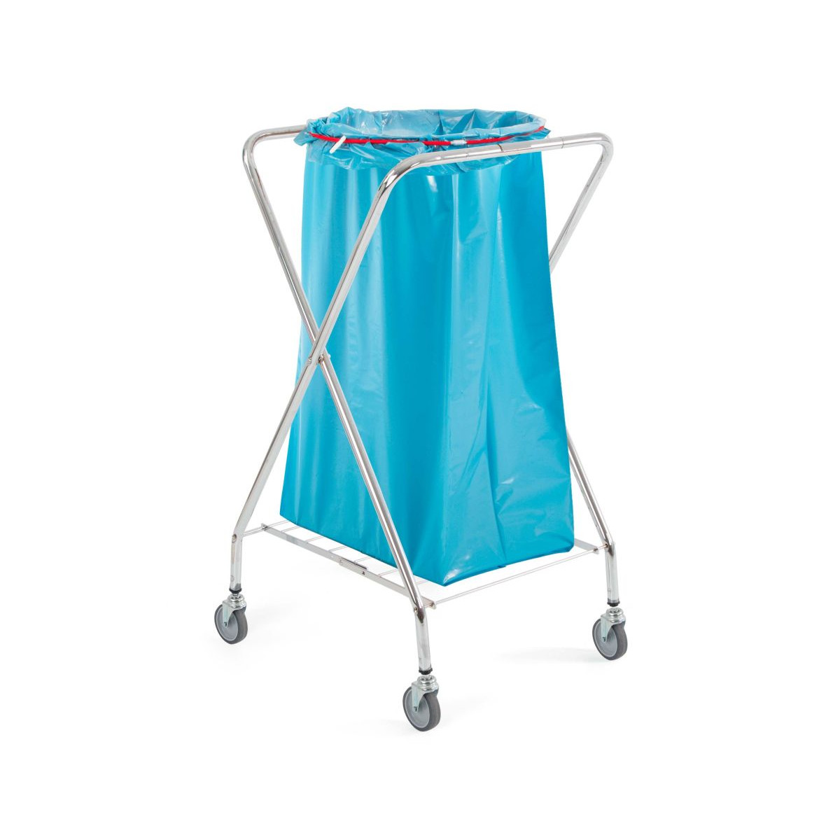 Chromowany wózek X z okrągłym uchwytem na worek 120 L, elastycznymi i piruetowymi kółkami ø 80 mm