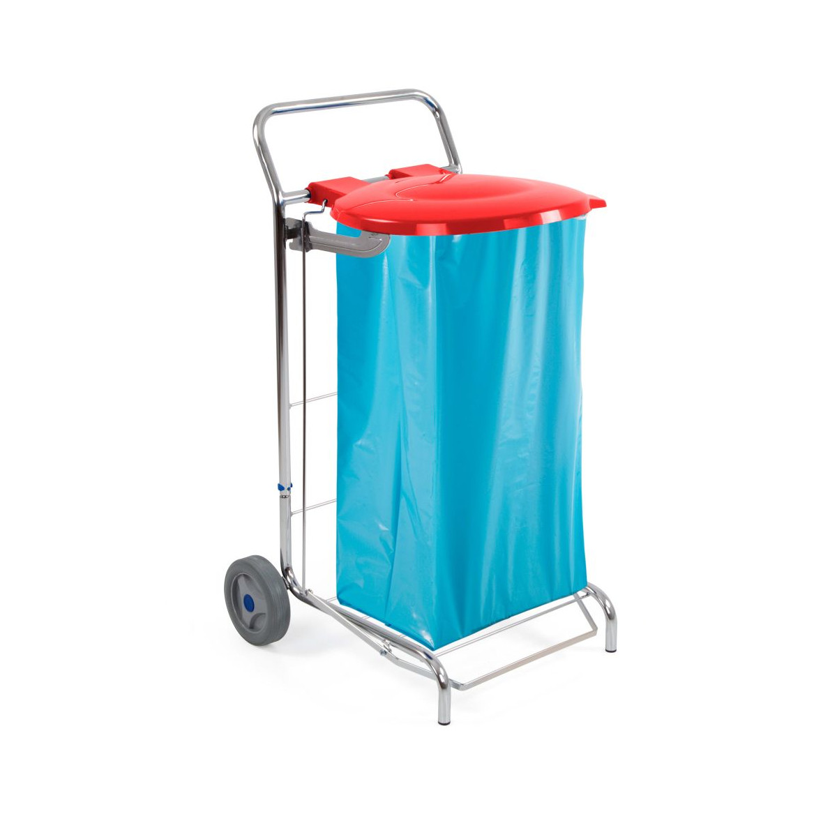 Chromowany wózek na odpady do użytku na zewnątrz z okrągłym uchwytem na worki 120 L, elastyczne kółka ø 175 mm, plastikowa osłona i pedał.