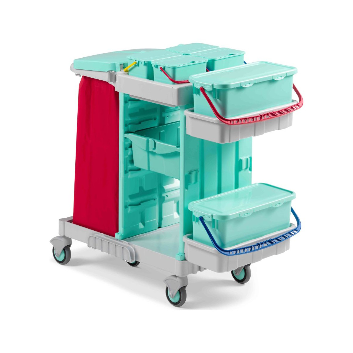 Wózek serwisowy Alpha A-B PLUS 0503700 to wózek używany do zbierania odpadów oraz do czyszczenia na mokro i / lub dezynfekcji w szpitalach, domach spokojnej starości, klinikach, gabinetach lekarskich, z systemem namaczania mopów, z hermetycznymi wiadrami Top-Down ® .