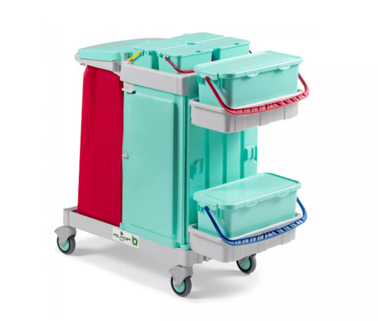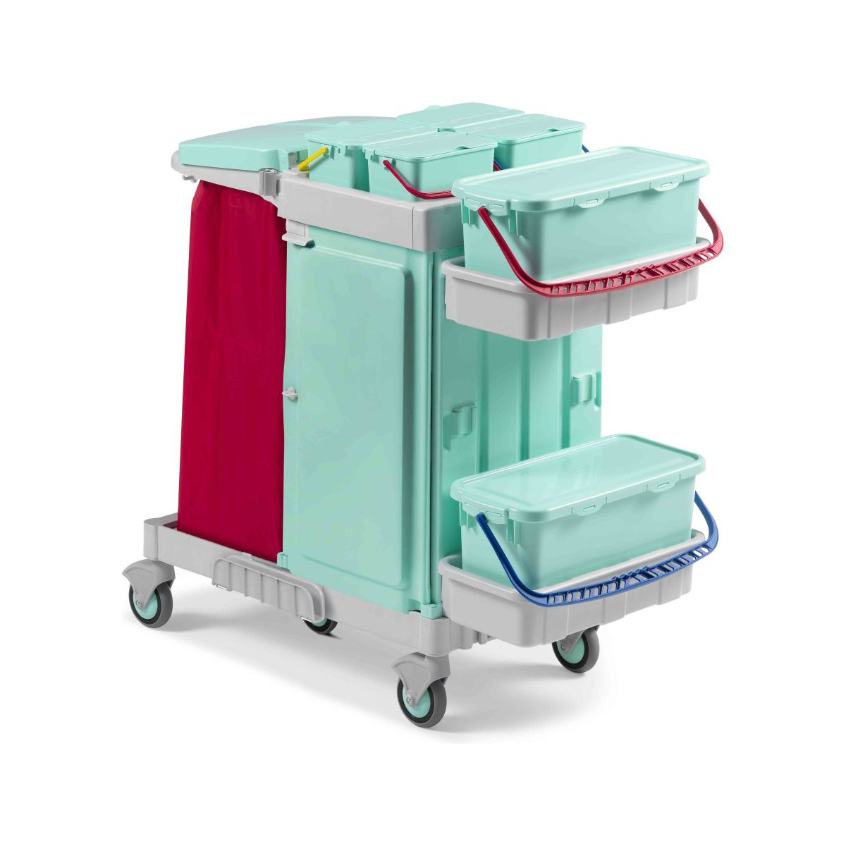 Wózek serwisowy Alpha A-B Plus 0603700 to wózek używany do zbierania odpadów oraz do czyszczenia na mokro i / lub dezynfekcji w szpitalach, domach spokojnej starości, klinikach, gabinetach lekarskich, z systemem namaczania mopów, z hermetycznymi wiadrami Top-Down ® .