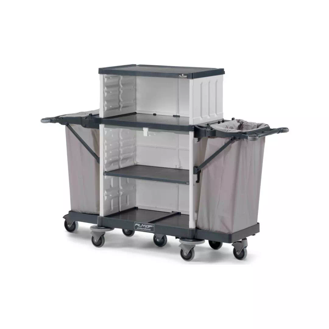Wózki z serii Emotion to linia wózków Filmop do ogólnego i profesjonalnego sprzątania w hotelach. Wózki Emotion są poręczne, mocne, niezwykle modułowe i wykonane z wysokiej jakości polipropylenu, od podstawy, po ramy pionowe, półki i wszystkie inne akcesoria. Otwarte lub całkowicie zamknięte - które gwarantują najwyższą higienę i maksimum bezpieczeństwa.
