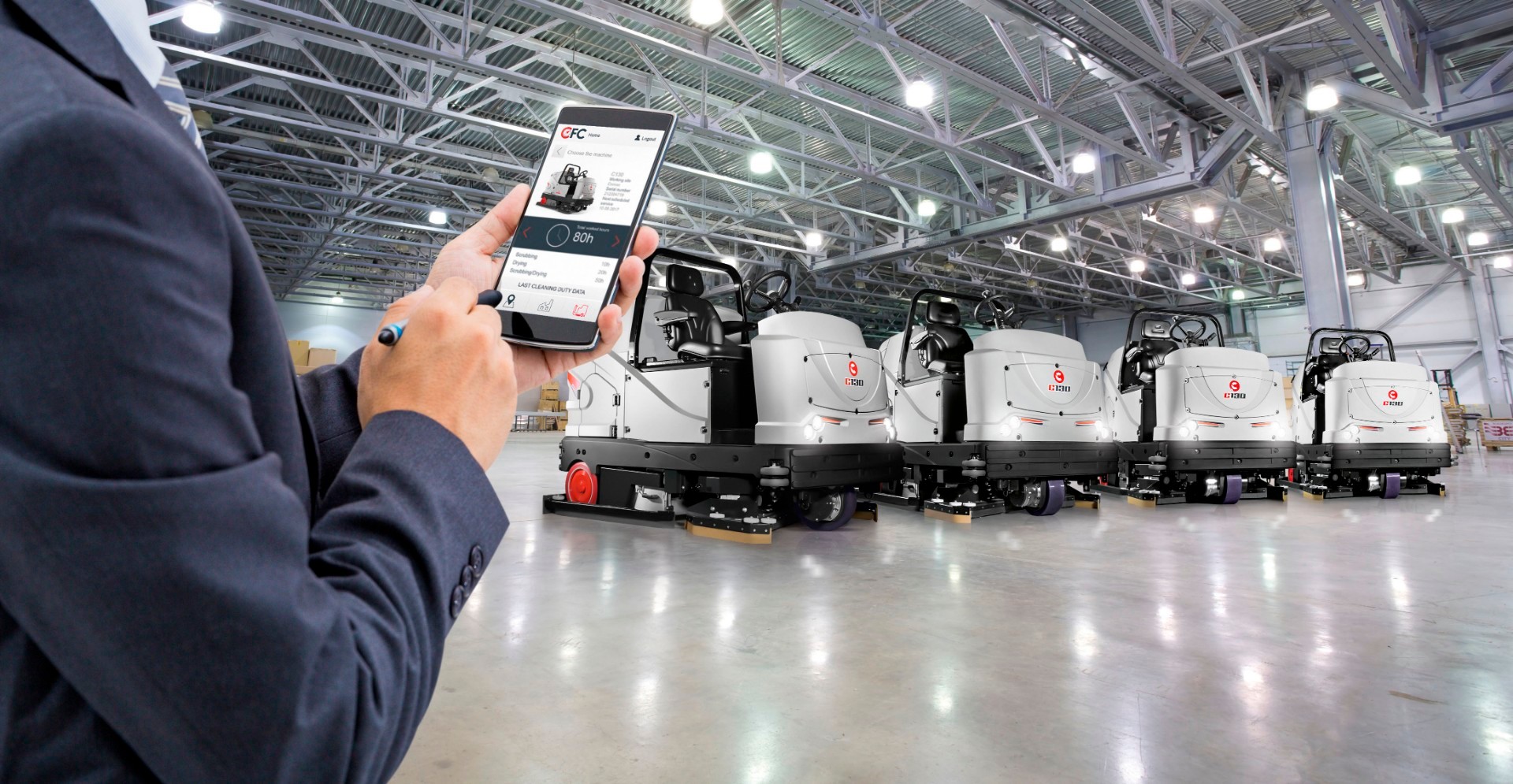 Maszyna czyszcząca samojezdna Comac C130 BS CDS CFC została wyposażona w niezbędne opcje do zarządzania flotą za pomocą Comac Fleet Care (CFC). Ten system umożliwia kontrolę na odległość - czy maszyny są w użyciu, gdzie i przez kogo są używane oraz czy wymagają natychmiastowej konserwacji - co pozwala uniknąć przestojów maszyny i kosztownych interwencji konserwacji nadzwyczajnej.