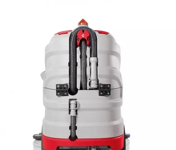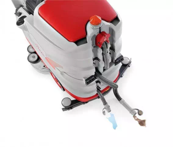 - hydrauliczny hamulec roboczyPrzewody rurowe umożliwiające opróżnienie zbiorników są umieszczone w tylnej części maszyny do mycia posadzek, w sposób wygodny i widoczny. Rozmieszczenie przewodu jest opracowane w celu uniknięcia przypadkowych wycieków spowodowanych ciśnieniem wody. Duża średnica przewodów stanowi zaletę, dzięki której operacja opróżniania przebiega w sposób sprawny i szybki.