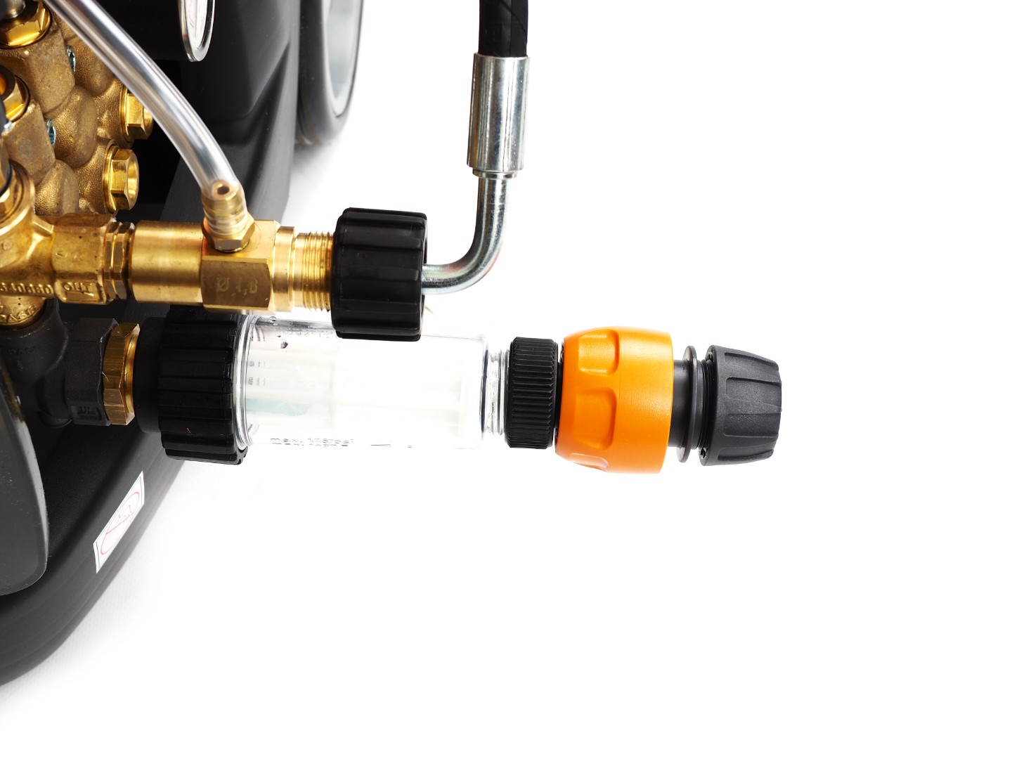 Myjki ciśnieniowe G-power C posiadają zewnętrzny inżektor umożliwiający pobieranie detergentu lub środka dezynfekującego wprost z kanistra zewnętrznego. Dodatkową zaletą jest brak kontaktu tego środka z elementami pompy. Standardowym wyposażeniem myjek jest zewnętrzny filtr wody.