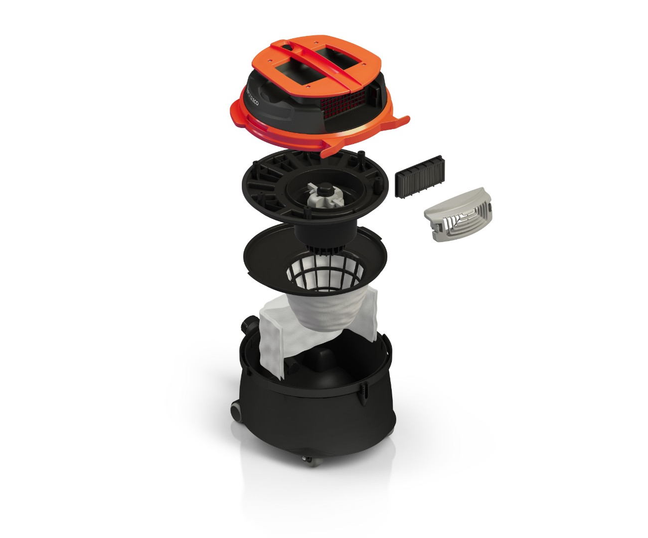 Plastikowe elementy odkurzacza są wykonane z materiałów powstałych w procesie recyklingu i nadają się w całości do ponownego przetworzenia.