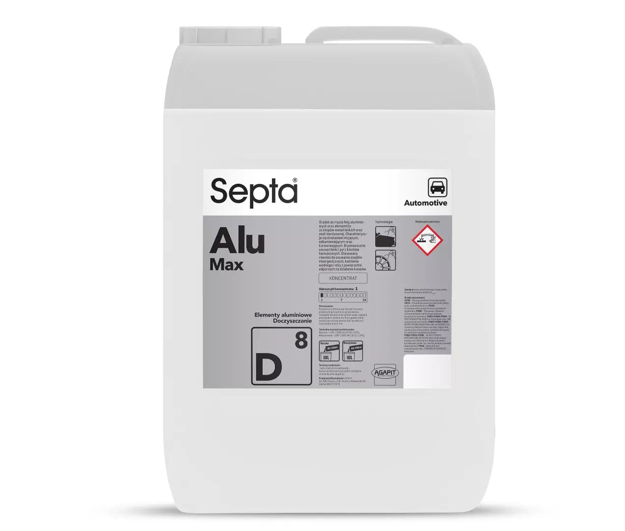 Septa Alumax D8 to koncentrat do mycia felg aluminiowych oraz elementów ze stopów metali lekkich oraz stali nierdzewnej. Charakteryzuje się działaniem myjącym, odkamieniającym oraz konserwującym. Błyskawicznie usuwa tlenki i pył z klocków hamulcowych. Stosowany również do usuwania osadów nieorganicznych, kamienia wodnego i rdzy z powierzchni odpornych na działanie kwasów.