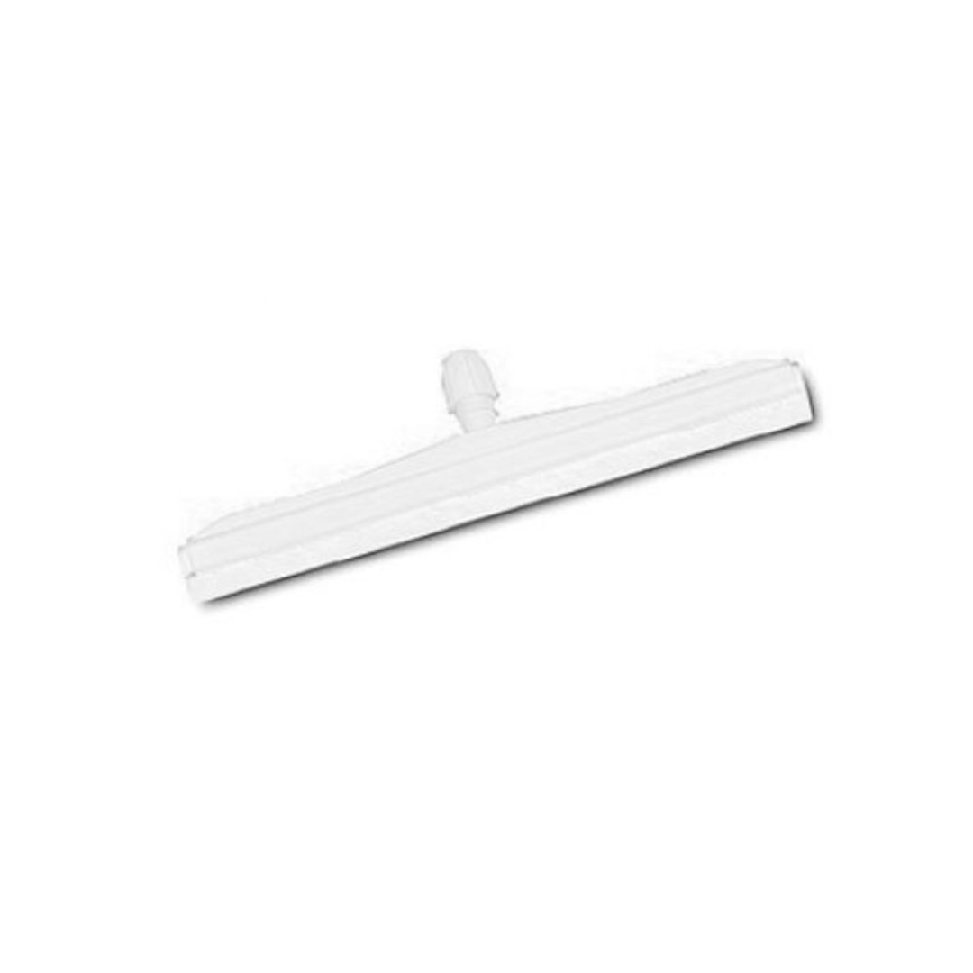 Plastikowa ściągaczka do podłóg z białą gumową listwą i kolorowym wspornikiem.