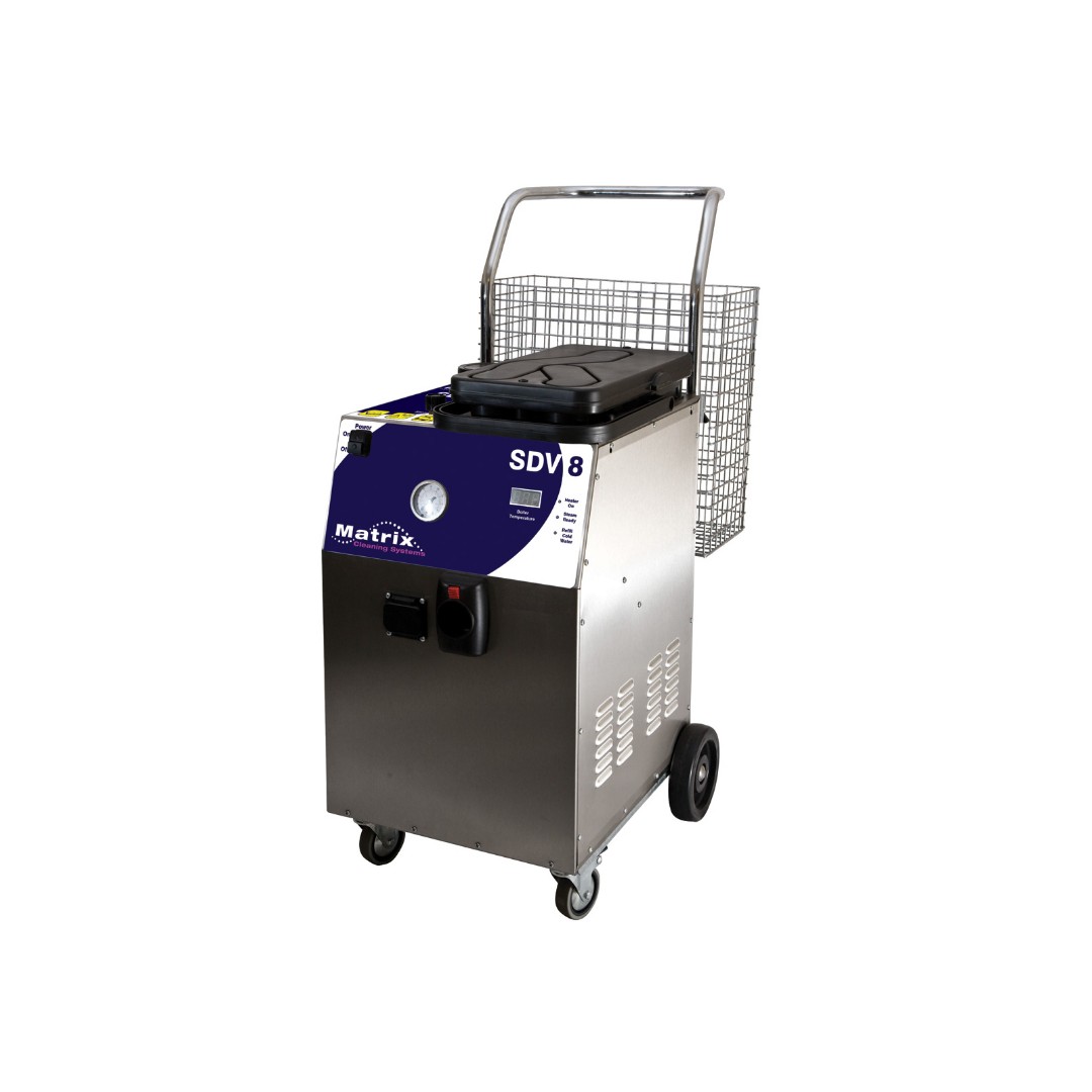 Matrix SDV8 to urządzenie do czyszczenia parą wykorzystujące do pracy parę o ciśnieniu 8 bar. Wyposażone w system odkurzania i dozowania detergentu do strumienia pary. Konstrukcja maszyny do czyszczenia parą jest wykonana ze stali nierdzewnej z opcją uzupełniania wody w bojlerze podczas pracy oraz ze zintegrowanym systemem zasysania. Para o wysokiej temperaturze wraz z detergentem wnika głęboko w powierzchnie zwiększając właściwości sanityzacyjne i skuteczność czyszczenia. Zintegrowany odkurzacz sprawia, że czyszczone powierzchnie pozostają czyste i suche zaraz po zakończeniu pracy. Skuteczny i wydajny przy usuwaniu gum do żucia.
