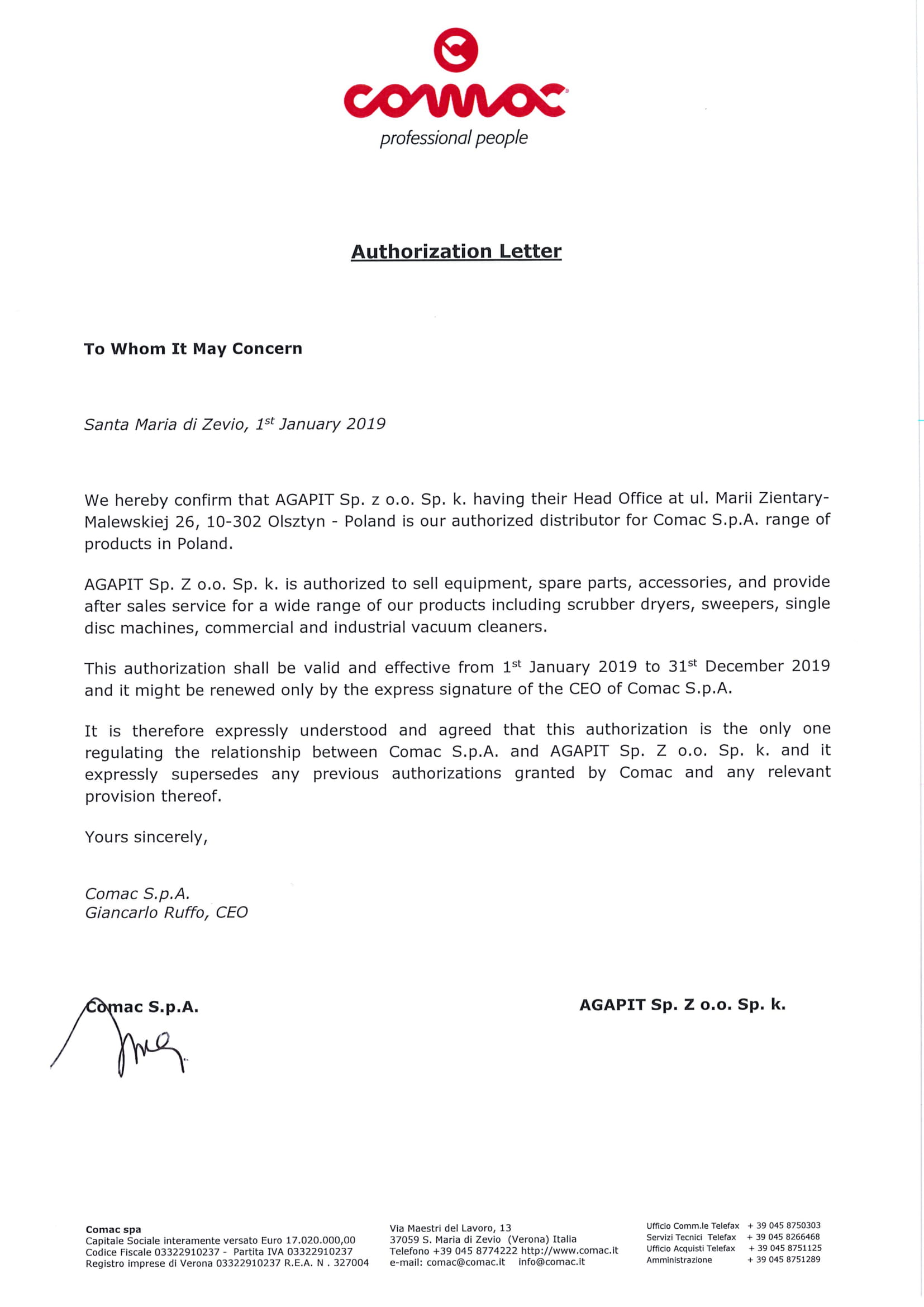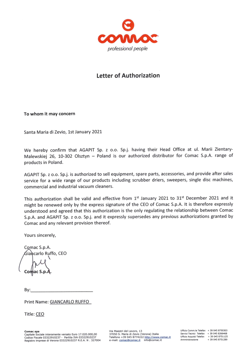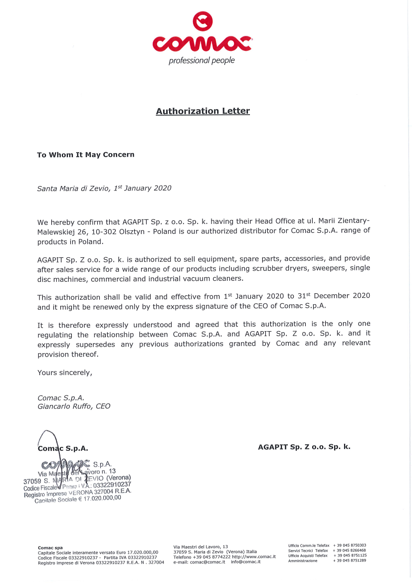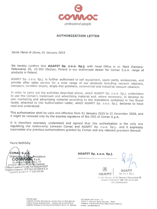Producent potwierdza w niej że Firma Agapit jest autoryzowanym i wyłącznym partnerem Comac w Polsce. Autoryzacja dotyczy sprzedaży i serwisu wszystkich urządzeń marki Comac.