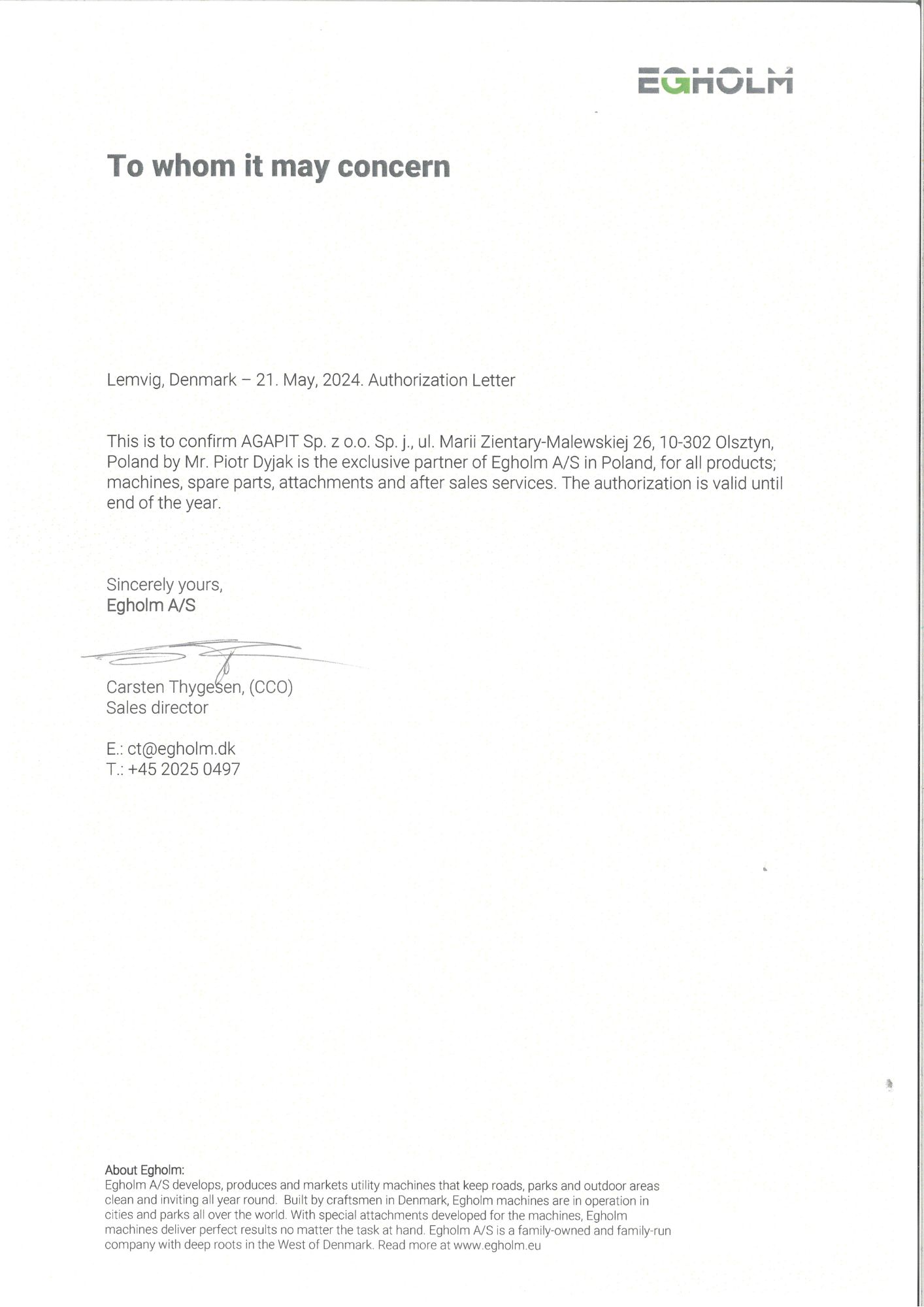Producent potwierdza w niej że Firma Agapit jest jedynym autoryzowanym partnerem Egholm w Polsce. Autoryzacja dotyczy sprzedaży i serwisu wszystkich urządzeń marki Egholm.