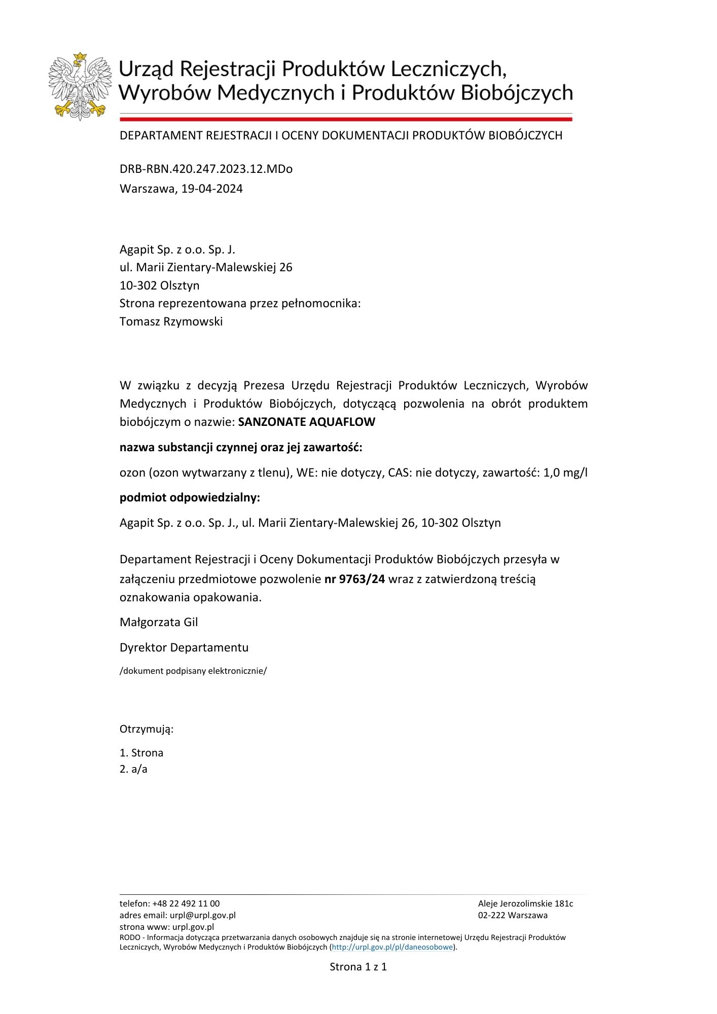 - Pozwolenie nr 9763/24 na obrót produktem biobójczym Sanzonate Aquaflow