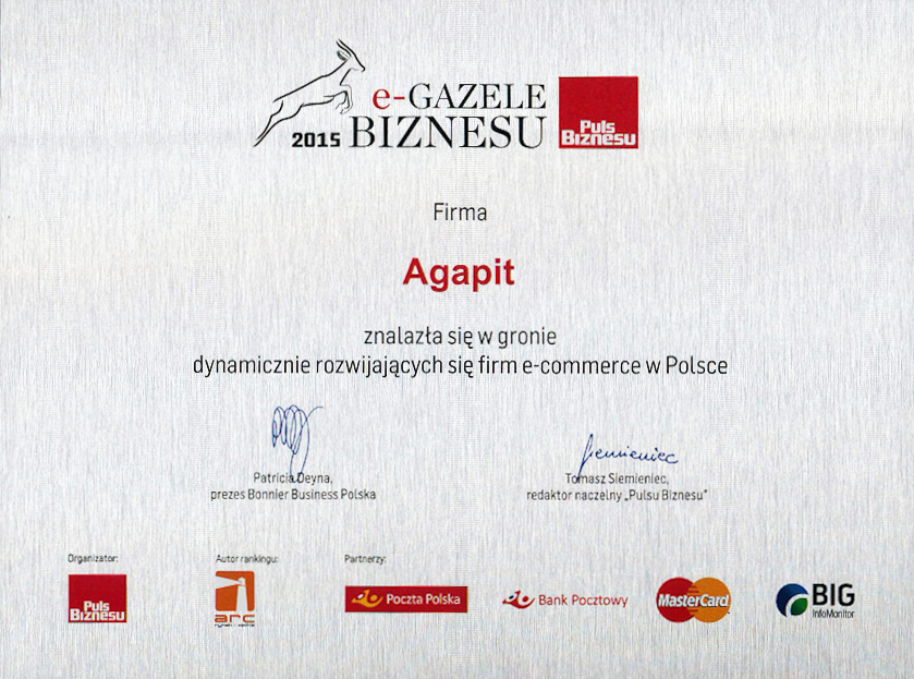 Ogólnopolski ranking firm prezentujący przedsiębiorstwa o najwyższej dynamice rozwoju. Firma Agapit uzyskała tytuł Gazeli Biznesu w latach 2008, 2009, 2010, 2016, 2017 zajmując wysokie pozycje.
