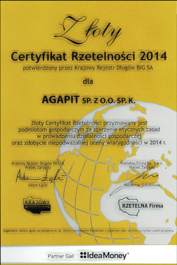 - Złoty Certyfikat Rzetelności 2014