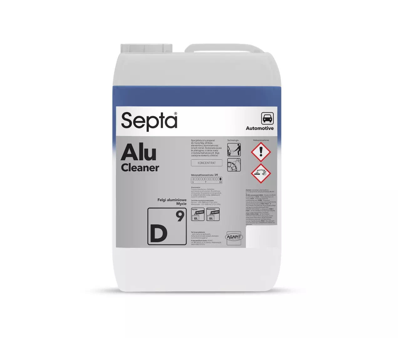 Septa Alucleaner D9 to specjalistyczny płyn do mycia felg, silników, elementów z aluminium oraz innych metali. Doskonale usuwa brud drogowy, a także osady z klocków hamulcowych. Myje zaolejone elementy silników. Produkt silnie skoncentrowany.