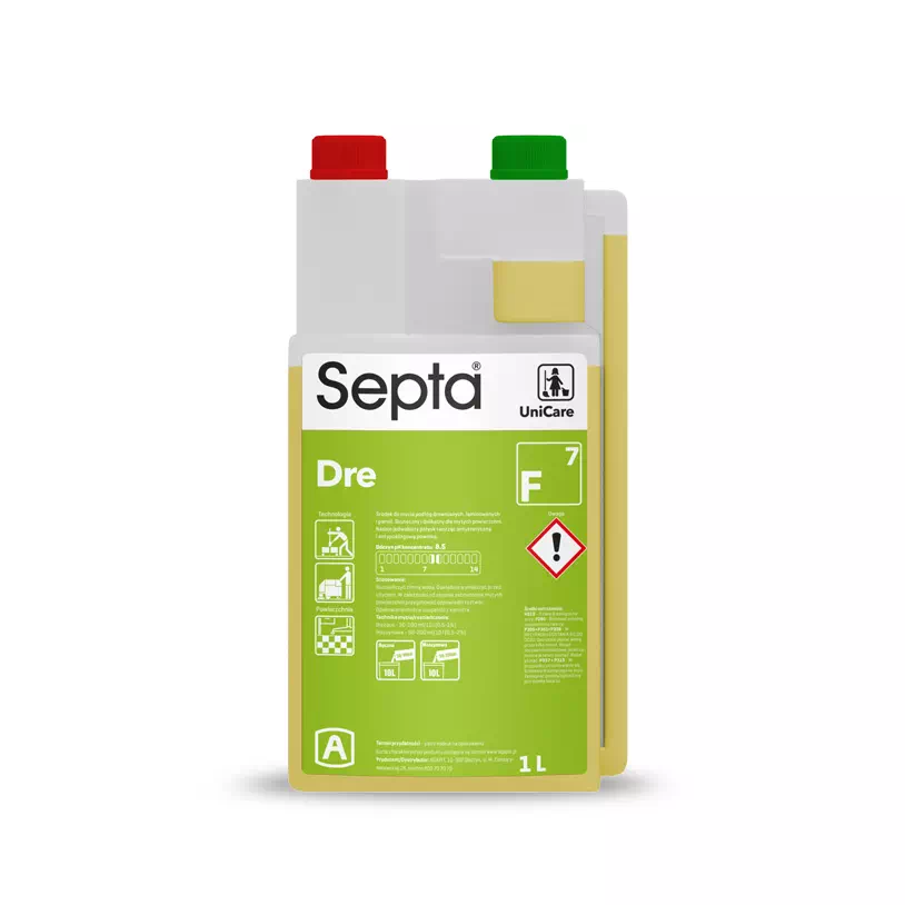 Septa DRE to płyn do podłóg drewnianych, laminowanych i paneli. Skuteczny i delikatny dla mytych powierzchni. Nadaje jedwabisty połysk tworząc antystatyczną i antypoślizgową powłokę.