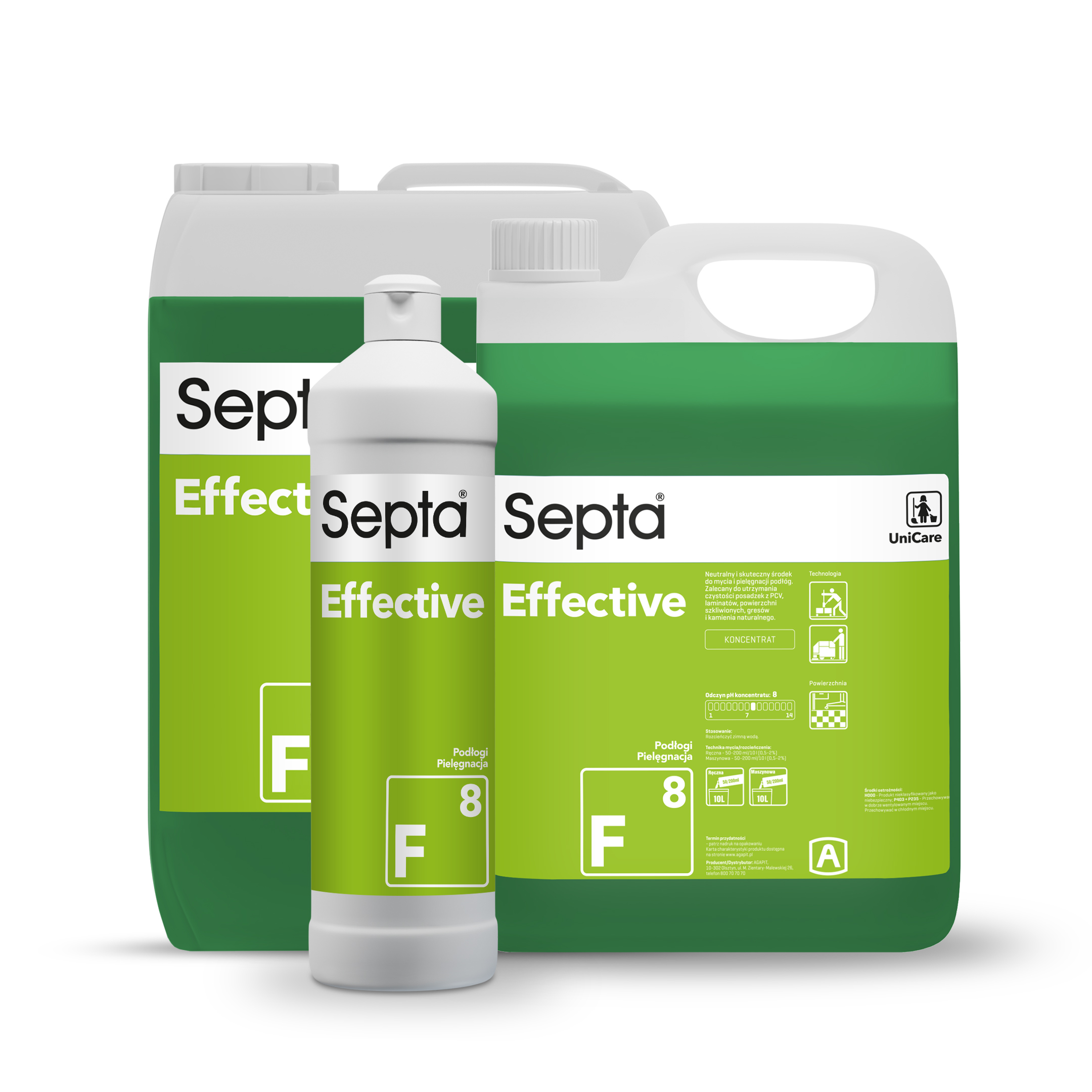 Septa Effective to neutralny i skuteczny profesjonalny środek czystości do mycia i pielęgnacji podłóg. Zalecany do utrzymania czystości posadzek z PVC, laminatów, powierzchni szkliwionych, gresów i kamienia naturalnego.
