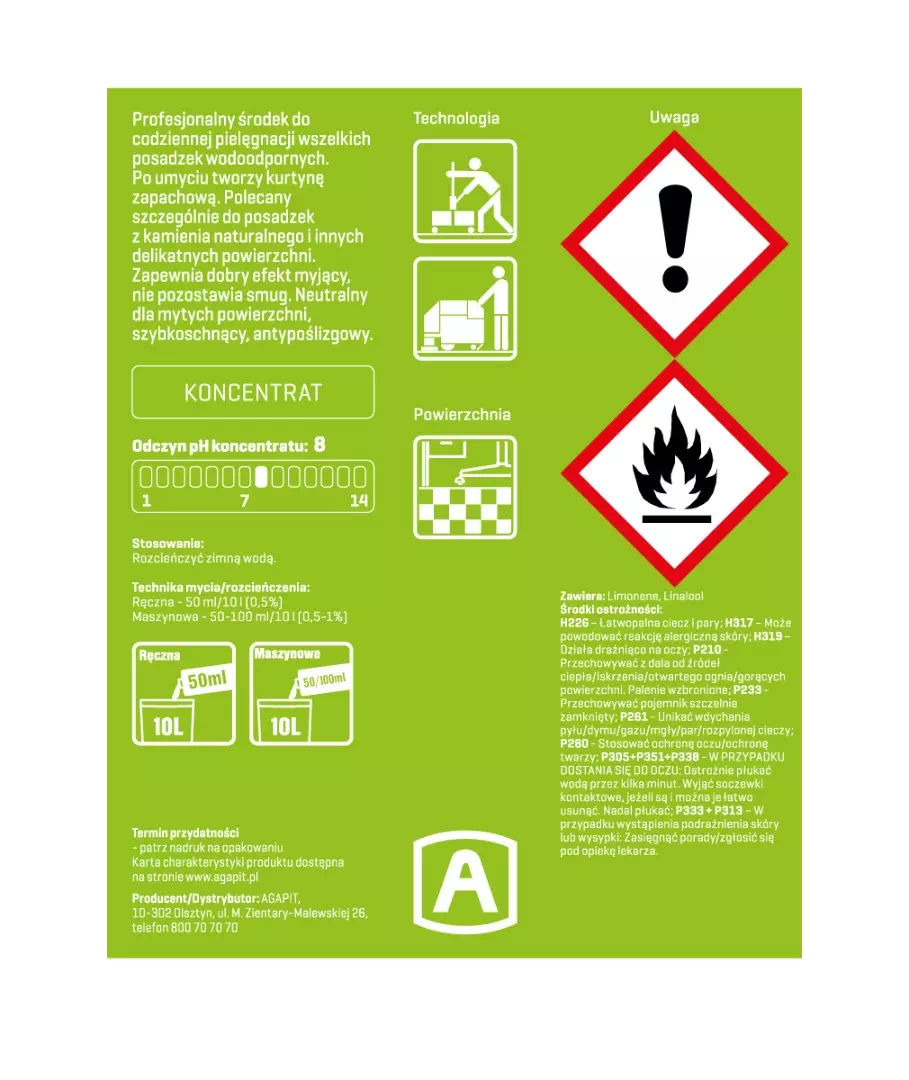 - 0,5-1% (50-100 ml/10 l wody).Dostępne pojemności: 1L, 5L, 10L, 200L.