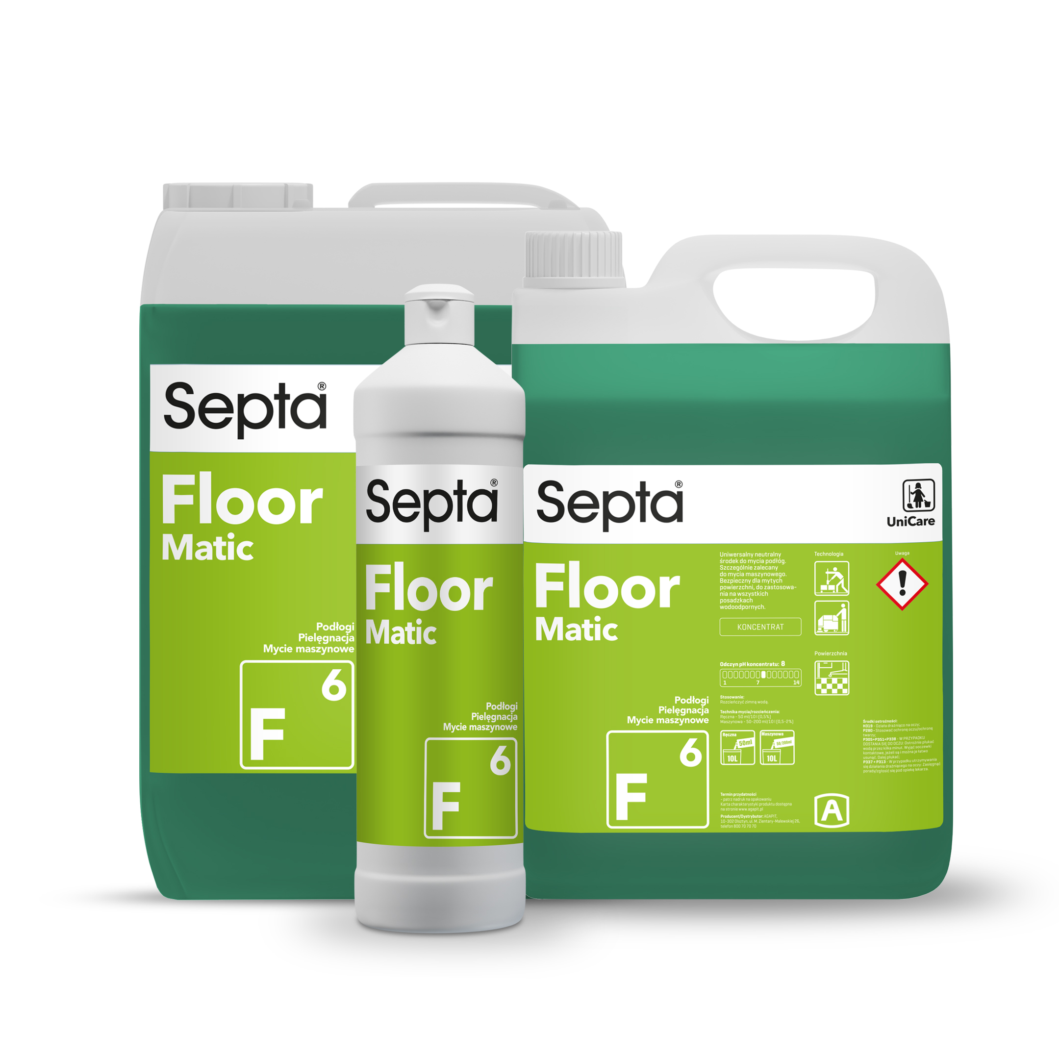 Septa Floor Matic F6 to uniwersalny neutralny środek do mycia podłóg. Szczególnie zalecany do mycia maszynowego. Bezpieczny dla mytych powierzchni, do zastosowania na wszystkich posadzkach wodoodpornych.