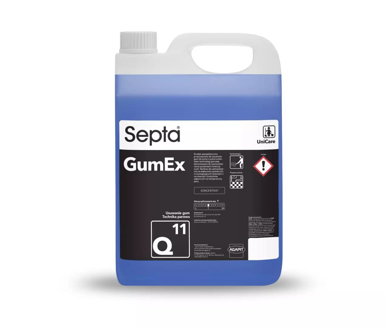 Septa Gumex Q11 to profesjonalna chemia do sprzątania przeznaczona do usuwania gum do żucia z wykorzystaniem technologii parowej, dostosowana do zastosowania w systemach inżekcyjnych. Możliwa do zastosowania na większości powierzchni wystepujących wewnątrz i na zewnątrz budynków odpornych na temperaturę pary.