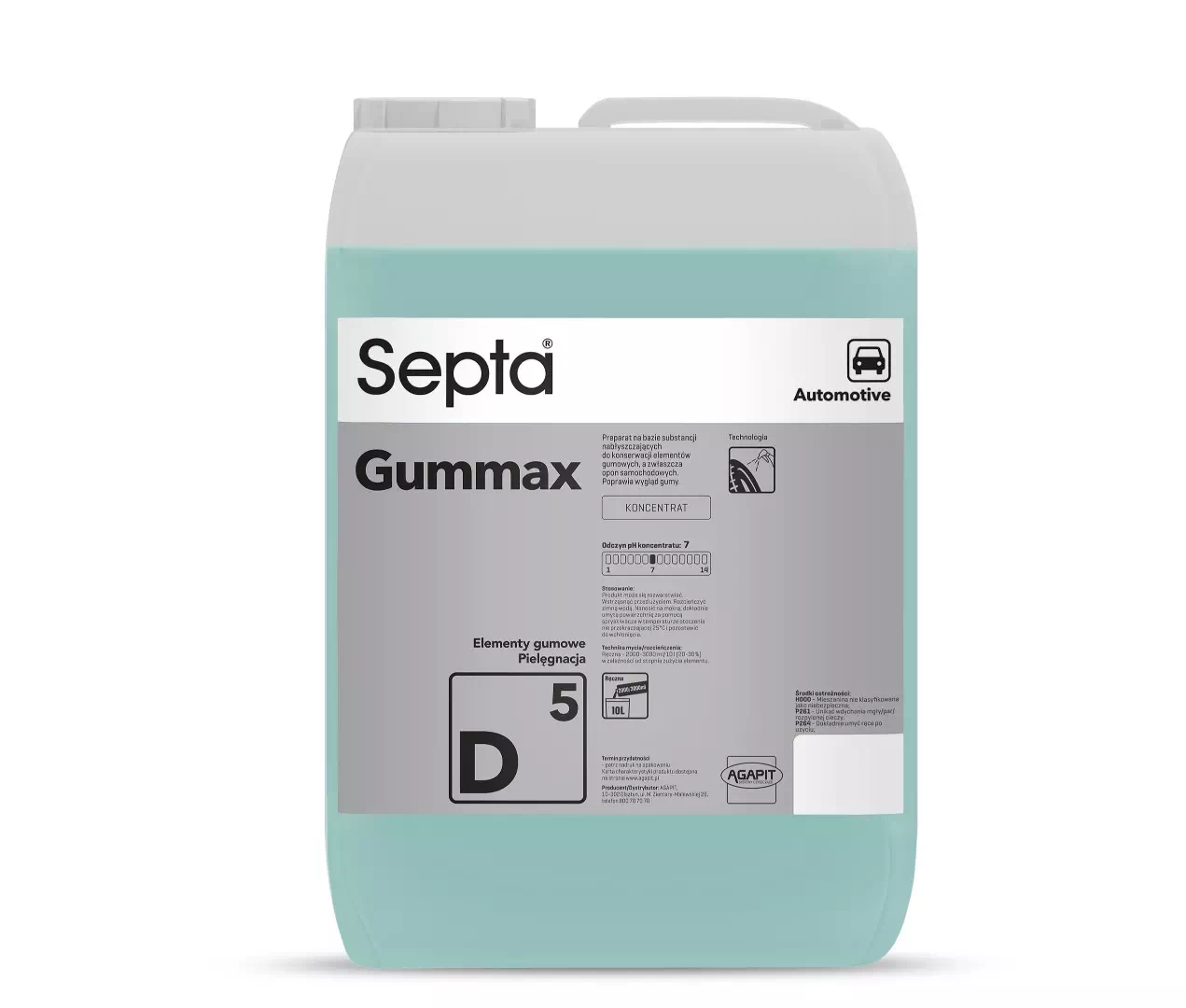 Septa Gummax D5 to profesjonalna chemia samochodowa na bazie substancji nabłyszczających do konserwacji elementów gumowych, a szczególnie opon samochodowych. Poprawia wygląd gumy.