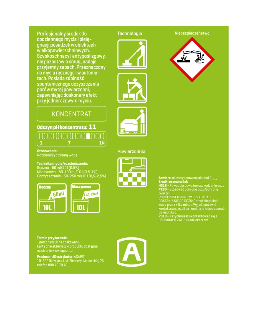 Przeznaczony do mycia ręcznego i w automatach. Posiada zdolność spontanicznego oczyszczania porów mytej powierzchni, zapewniając doskonały efekt przy jednorazowym myciu.