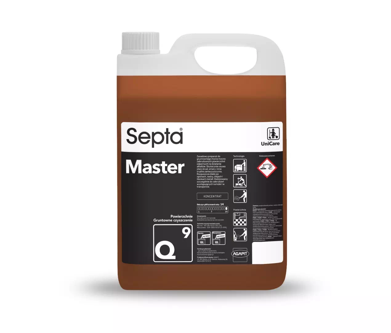 Septa Master Q9 to zasadowy preparat do gruntownego mycia mocno zabrudzonych powierzchni odpornych na działanie alkaliów. Skutecznie usuwa stary brud, smary i inne trudne zanieczyszczenia. Rozpuszcza ślady po oponach, sadzy, olejach i tlenkach metali. Profesjonalna chemia czyszcząca dedykowana szczególnie do zabrudzeń wystepujących na kolei i w transporcie.