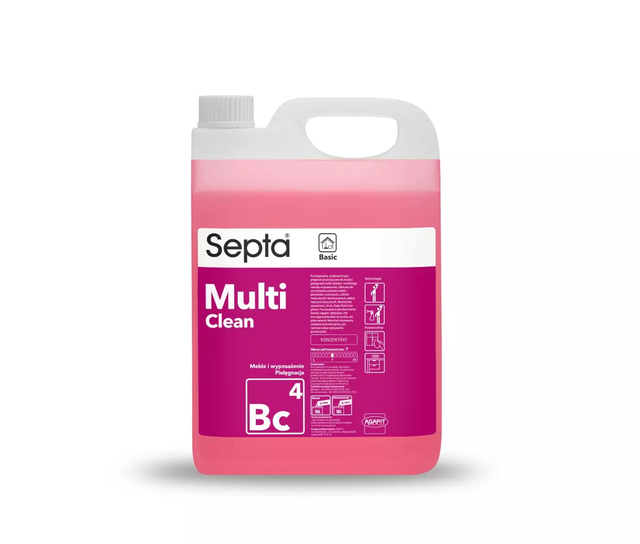 Septa Multiclean BC4 to profesjonalny, szybkoschnący preparat przeznaczony do mycia i pielęgnacji mebli, blatów i wszelkiego rodzaju wyposażenia. Zalecany do utrzymania czystości mebli z połyskiem, matowych, z oklein naturalnych i laminowanych, pleksi, tworzyw sztucznych. Skutecznie usuwa kurz, brud, ślady dłoni oraz plamy. Pozostawia w pomieszczeniu świeży zapach. Odświeża i nie wymaga wycierania do sucha, ani polerowania. Chemia do sprzątania mebli Septa Multiclean BC4 może być stosowana zarówno w formie spray, jak i roztworu do przemywania powierzchni.