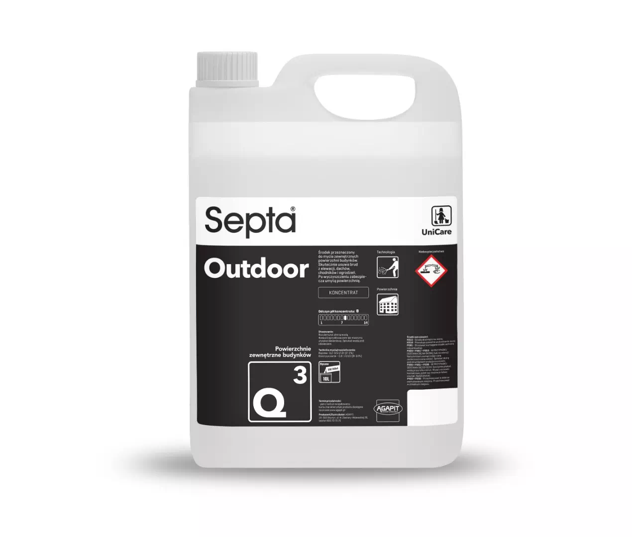 Septa Outdoor Q3 to profesjonalny środek czystości przeznaczony do mycia zewnętrznych powierzchni budynków. Skutecznie usuwa brud z elewacji, dachów, chodników i ogrodzeń. Po wyczyszczeniu zabezpiecza umytą powierzchnię.