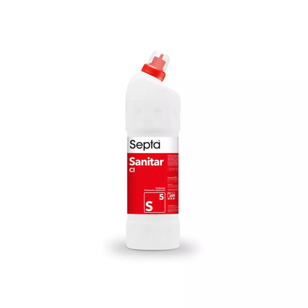 Septa Sanitar CL S5 to profesjonalny środek czyszczący z aktywnym chlorem do mycia powierzchni sanitarnych. Usuwa pleśnie, dezynfekuje i skutecznie czyści z osadów i nacieków. Do zastosowania wyłącznie na powierzchniach odpornych na działanie chloru.