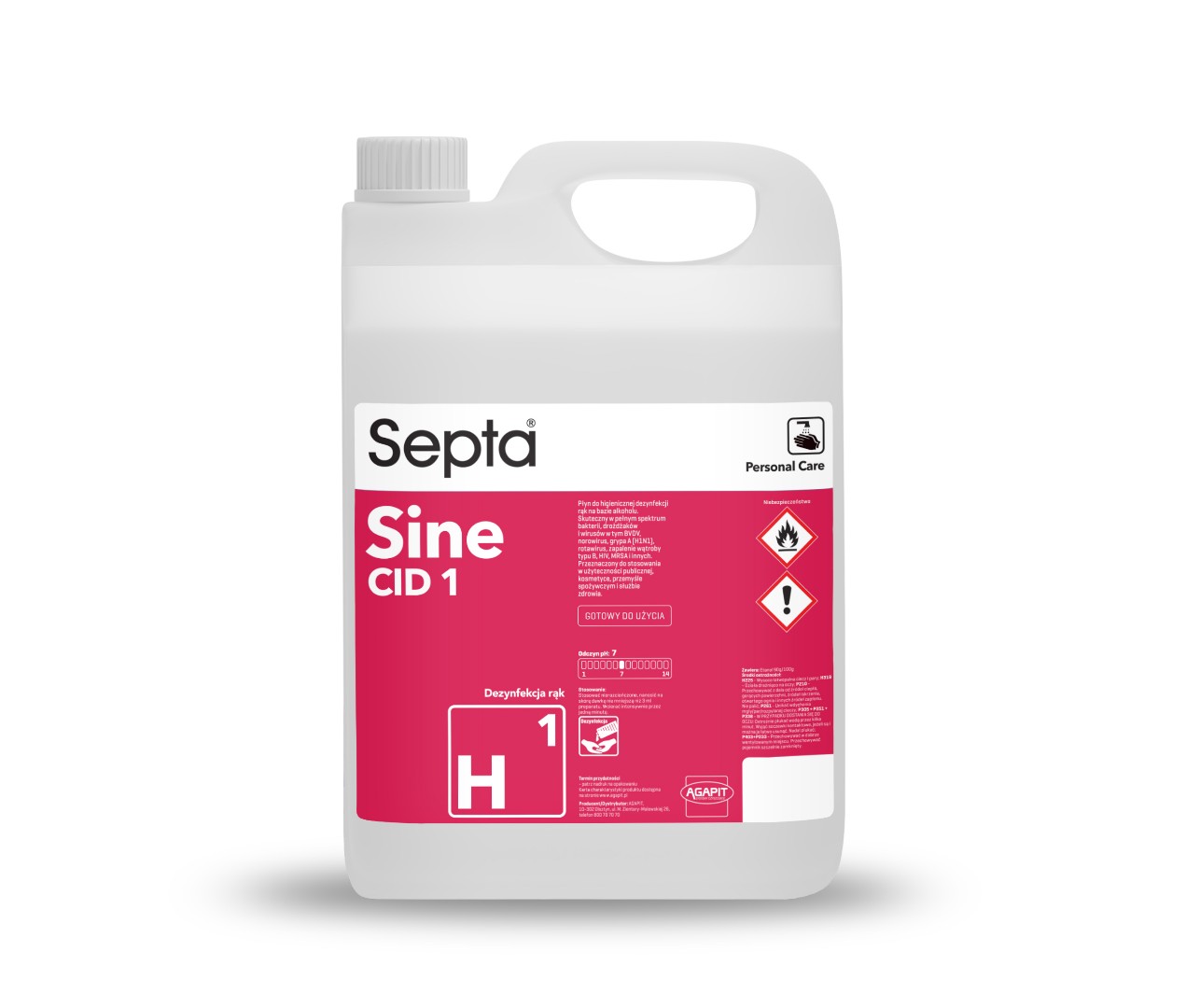 Septa Sine Cid 1 H1 to gotowy do użycia płyn do dezynfekcji rąk na bazie alkoholu.