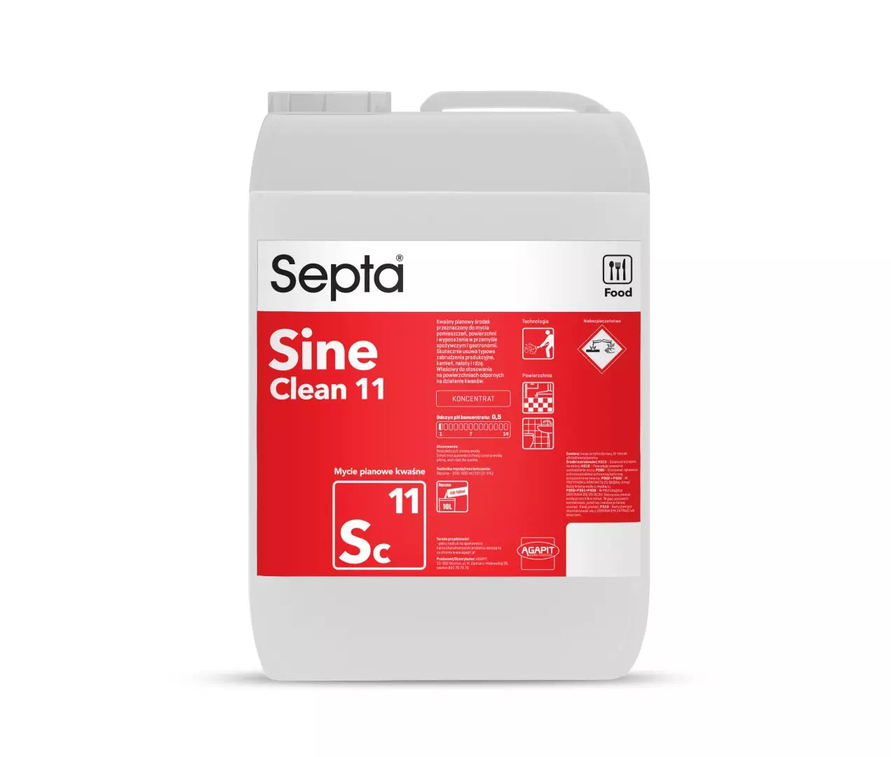 Septa Sine Clean 11 SC11 to profesjonalne środki czystości dla gastronomii. Kwaśny pianowy preparat przeznaczony do mycia pomieszczeń, powierzchni i wyposażenia w przemyśle spożywczym i gastronomii. Skutecznie usuwa typowe zabrudzenia produkcyjne, kamień, naloty i rdzę. Właściwy do stosowania na powierzchniach odpornych na działanie kwasów.