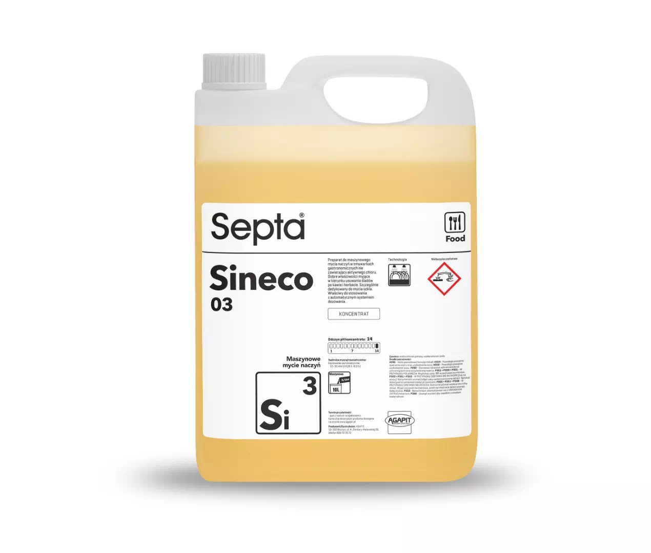 Septa Sineco 03 SI3 to preparat do maszynowego mycia naczyń w zmywarkach gastronomicznych nie zawierający aktywnego chloru. Dobre właściwości myjące w kierunku usuwania śladów po kawie i herbacie. Szczególnie dedykowany do mycia szkła. Właściwy do stosowania z automatycznym systemem dozowania.