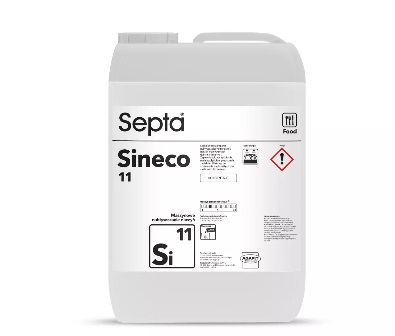 Septa Sineco 11 SI11 to lekko kwaśny preparat nabłyszczający do płukania naczyń w zmywarkach gastronomicznych. Zapewnia dokładne płukanie, nadaje połysk i nie pozostawia zacieków. Właściwy do stosowania z automatycznym systemem dozowania.