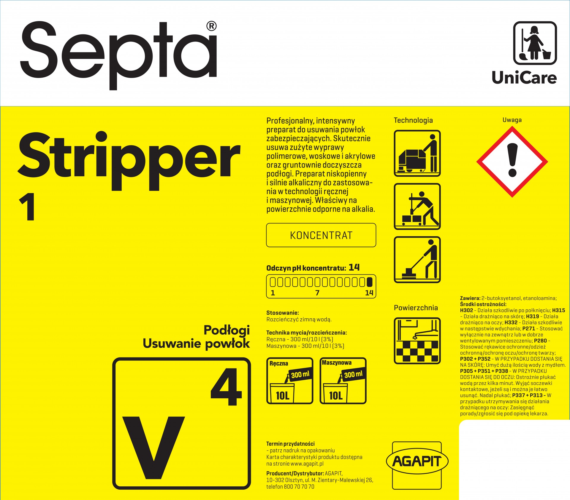 Septa Stripper 1 V4 to profesjonalny intensywny preparat do usuwania powłok zabezpieczających. Skutecznie usuwa zużyte wyprawy polimerowe, woskowe i akrylowe oraz gruntownie doczyszcza podłogi. Preparat niskopienny i silnie alkaliczny do zastosowania w technologii ręcznej i maszynowej. Właściwy na powierzchnie odporne na alkalia.