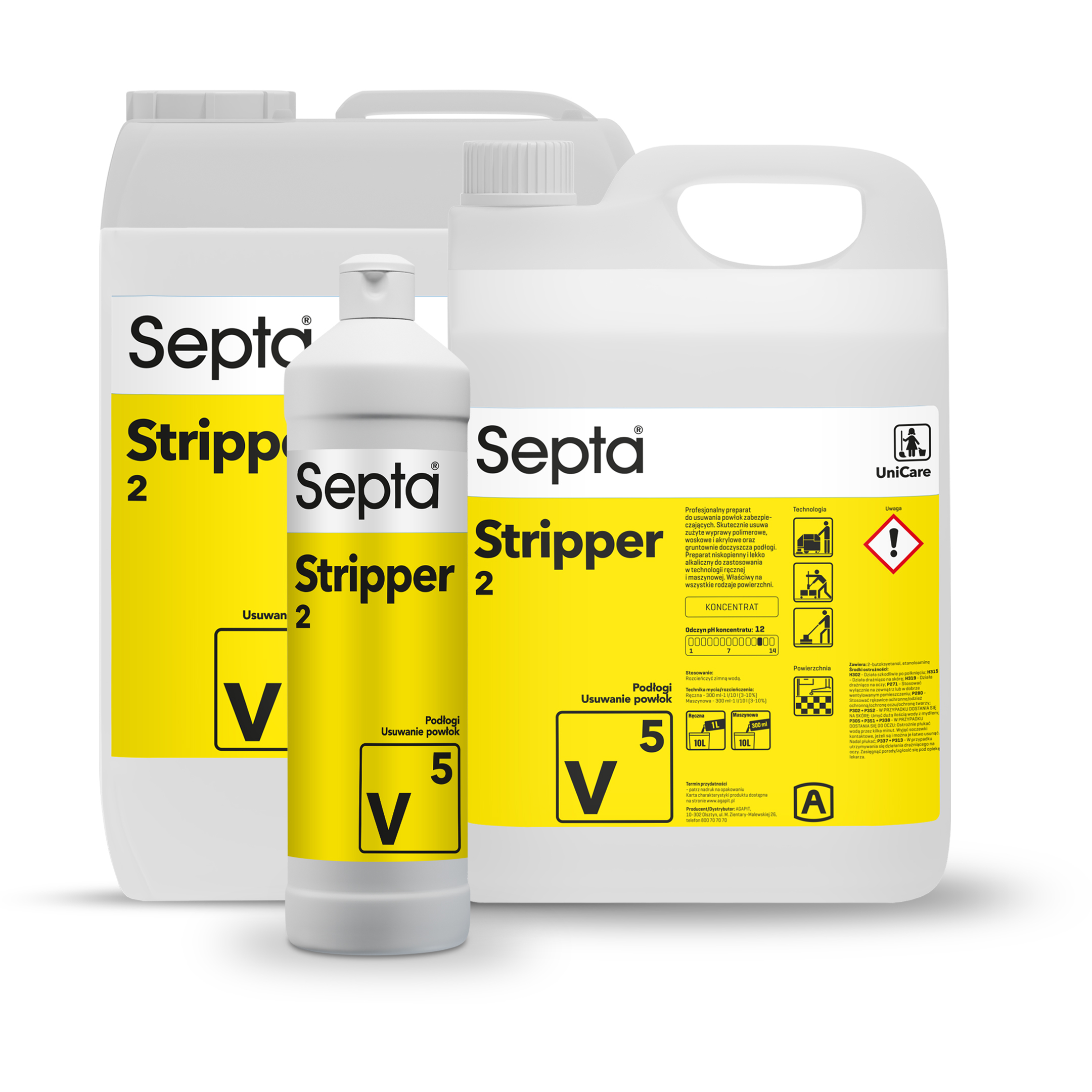 Septa Stripper 2 V5 to profesjonalny preparat do usuwania powłok zabezpieczających. Skutecznie usuwa zużyte wyprawy polimerowe, woskowe i akrylowe oraz gruntownie doczyszcza podłogi. Preparat niskopienny i lekko alkaliczny do zastosowania w technologii ręcznej i maszynowej. Właściwy na wszystkie rodzaje powierzchni.
