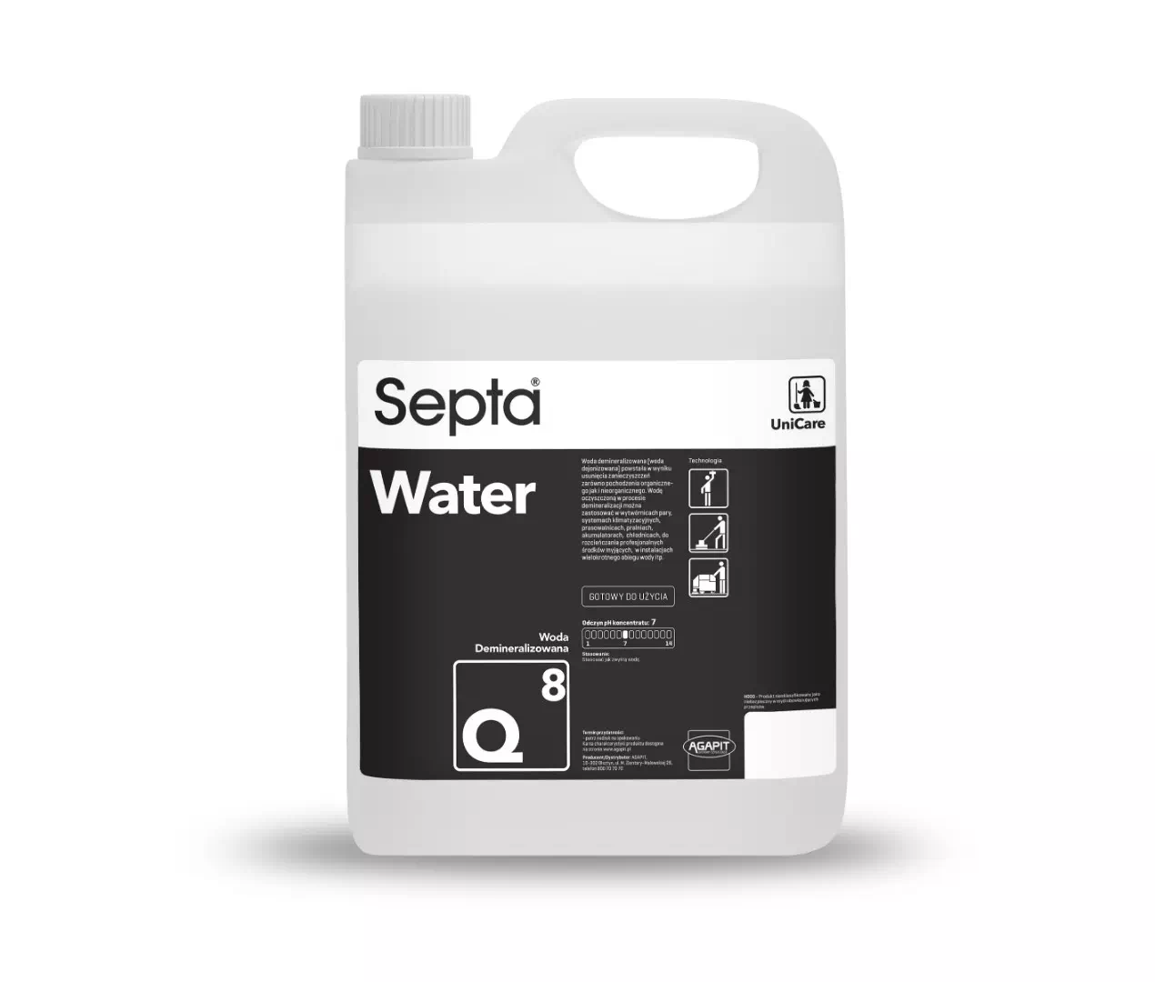 Septa Water Q8 to woda demineralizowana (woda dejonizowana) powstała w wyniku usunięcia zanieczyszczeń zarówno pochodzenia organicznego jak i nieorganicznego. Wodę oczyszczoną w procesie demineralizacji można zastosować w wytwornicach pary, systemach klimatyzacyjnych, prasowalnicach, pralniach, akumulatorach, chłodnicach, do rozcienczania profesjonalnych środków myjących, w instalacjach wielokrotnego obiegu wody itp.