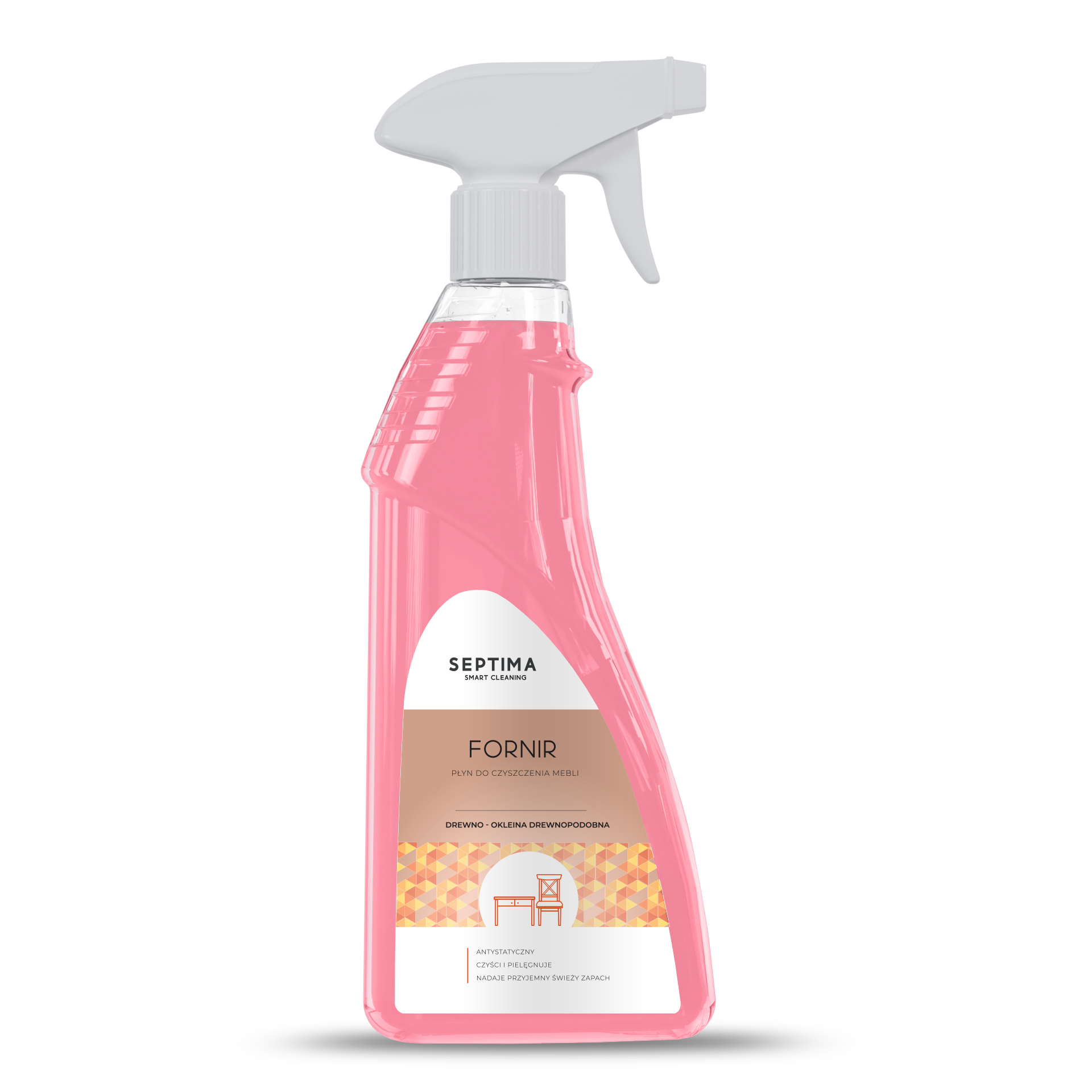 Septima Fornin to delikatny preparat o świeżym zapachu dedykowany do pielęgnacji mebli drewnianych, w okleinie drewnianej i drewnopodobnej. Płyn posiada właściwości antystatyczne oraz dodatki zwilżające, które ułatwiają czyszczenie i nadają połysk. Specjalnie dobrana formuła gwarantuje brak smug oraz zapobiega zabrudzeniom. Składniki zapewniające właściwości elektrostatyczne pomagają usuwać kurz i zapobiegają jego ponownemu osiadaniu. Preparat chroni czyszczone powierzchnie i pozostawia przyjemny zapach.